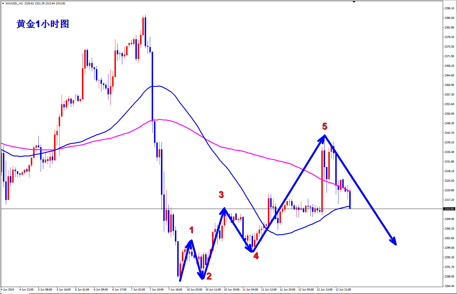 黄金1小时经过小五浪的上涨反弹结束了本轮反弹,黄金接下来还是继续回归空头趋势,黄金早盘反弹继续干空,黄金昨晚美盘CPI数据利多黄金依然承压2340冲高回落,黄金早盘反弹2340下都是给逢高干空的机会。黄金昨日美联储利率决议后下跌反弹最高也就2325一线,早盘反弹2325承压依然可以先空起来。