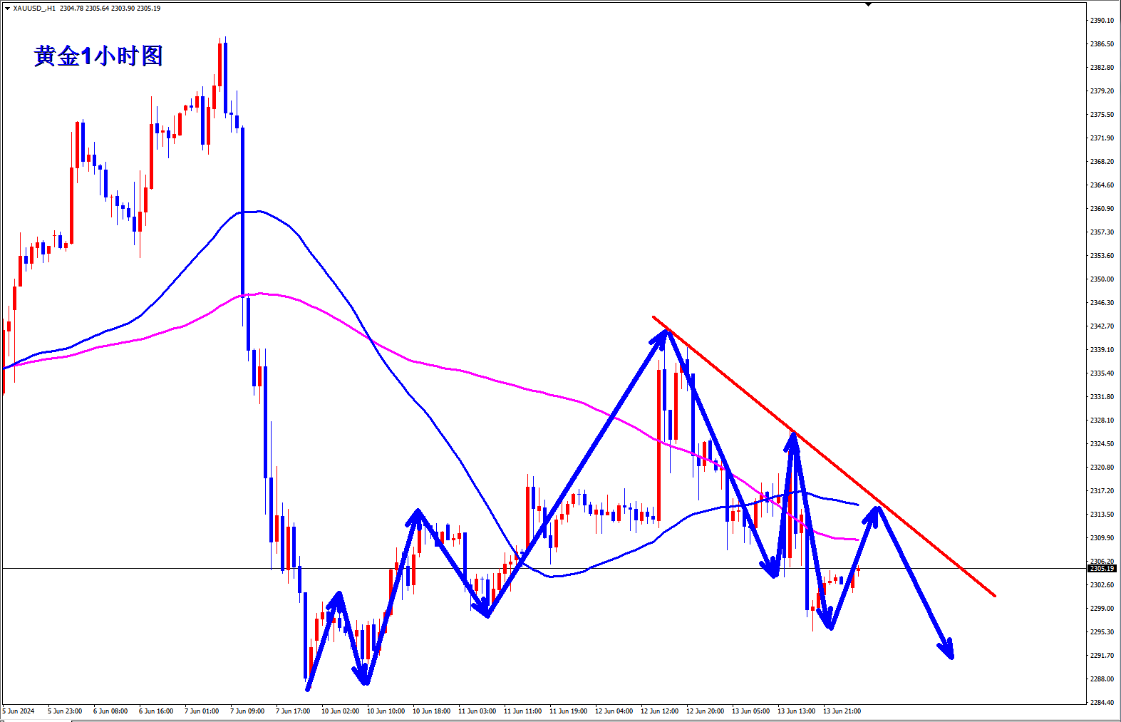 黄金1小时反弹弱势,然后现在形成了下跌趋势,黄金下跌趋势线阻力下移到2313附近,今天反弹2313下都是逢高给干空的机会,早盘反弹承压2313可以继续干空。黄金1小时小五浪上涨结束了本轮上涨,接下来继续空头趋势。