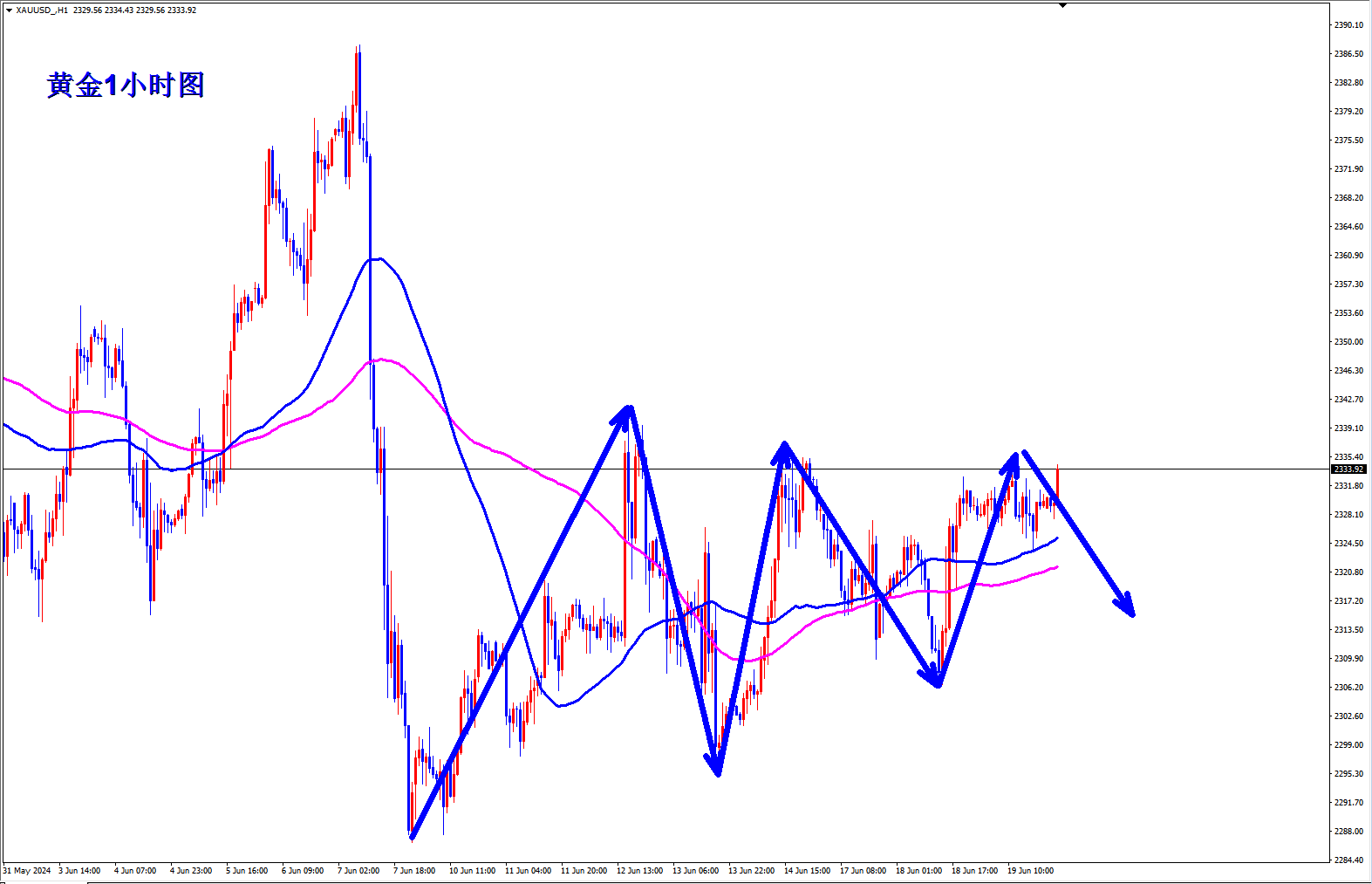 黄金1小时图还是震荡走势,黄金短线还是承压2335附近一线的阻力,震荡行情,就不要轻易追多,避免来回追涨杀跌,黄金还是震荡,黄金早盘2335附近可以先空起来了,只有等黄金强势突破震荡区间我们再考虑行情是否反转,大趋势现在还是在下跌中,现在黄金震荡也仅仅是下跌的中继。