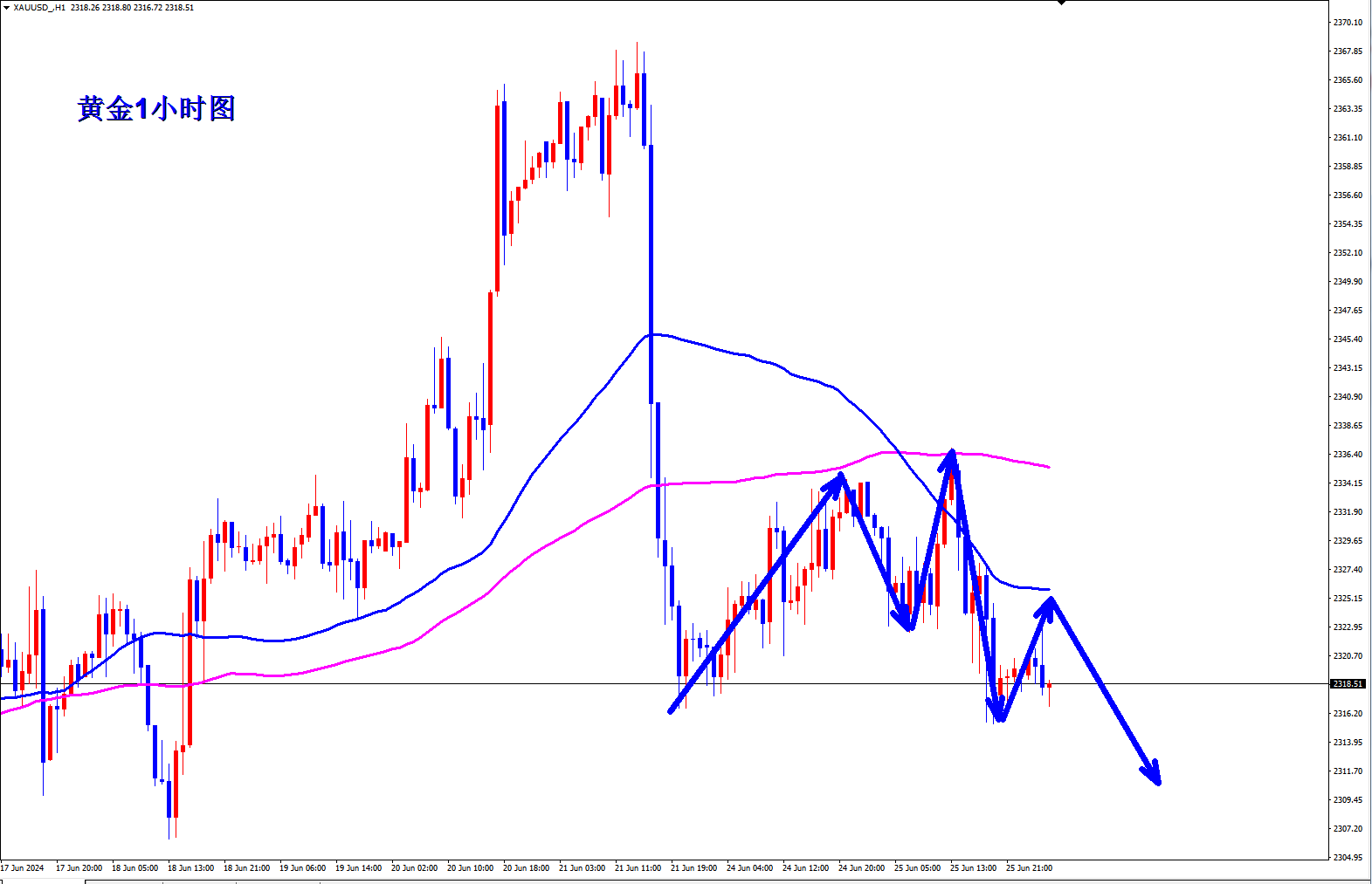黄金这两天反弹修正结束,黄金继续下跌走势,黄金反弹弱势,早盘现价2319直接空,黄金即将跌破2300,我们拭目以待!