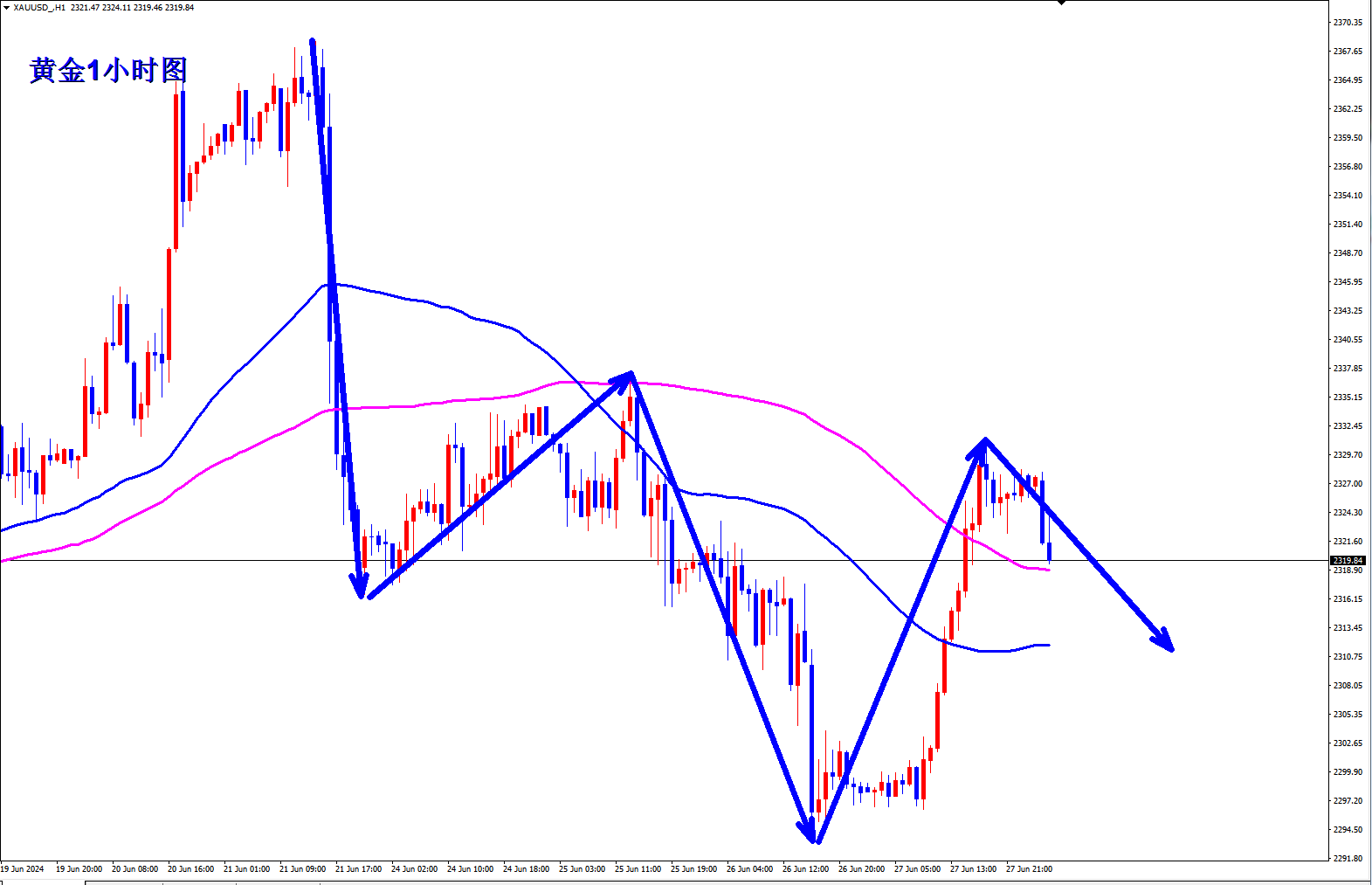 黄金1小时还是没有到达强势深V的程度,黄金反弹也就仅仅是反弹,黄金昨日反弹2330上方多次受阻,黄金短线继续承压昨天高点2331,今天2331下都是给逢高干空的机会,黄金早盘反弹2330附近可以继续先空起来。