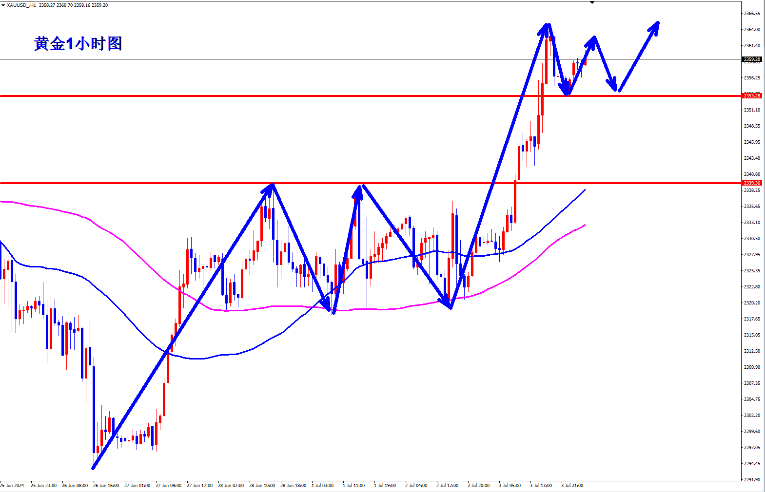 黄金1小时突破箱体震荡,黄金突破之后没有快速回落,黄金在箱体上方已经企稳了,黄金回落就是给干多的机会,黄金昨晚美盘回踩2353一线形成支撑,黄金早盘回落2353支撑企稳可以继续先干多。