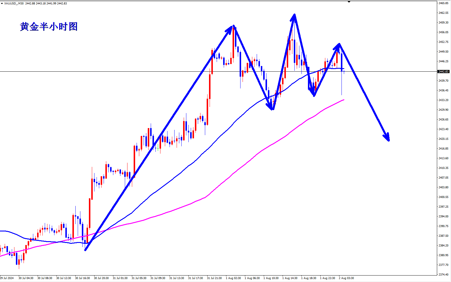 黄金30分钟均线开始拐头,黄金30分钟图有头肩顶的形态,黄金短线已经开始承压,黄金早盘反弹2452阻力下逢高空,黄金早盘反弹2450附近可以先空起来。