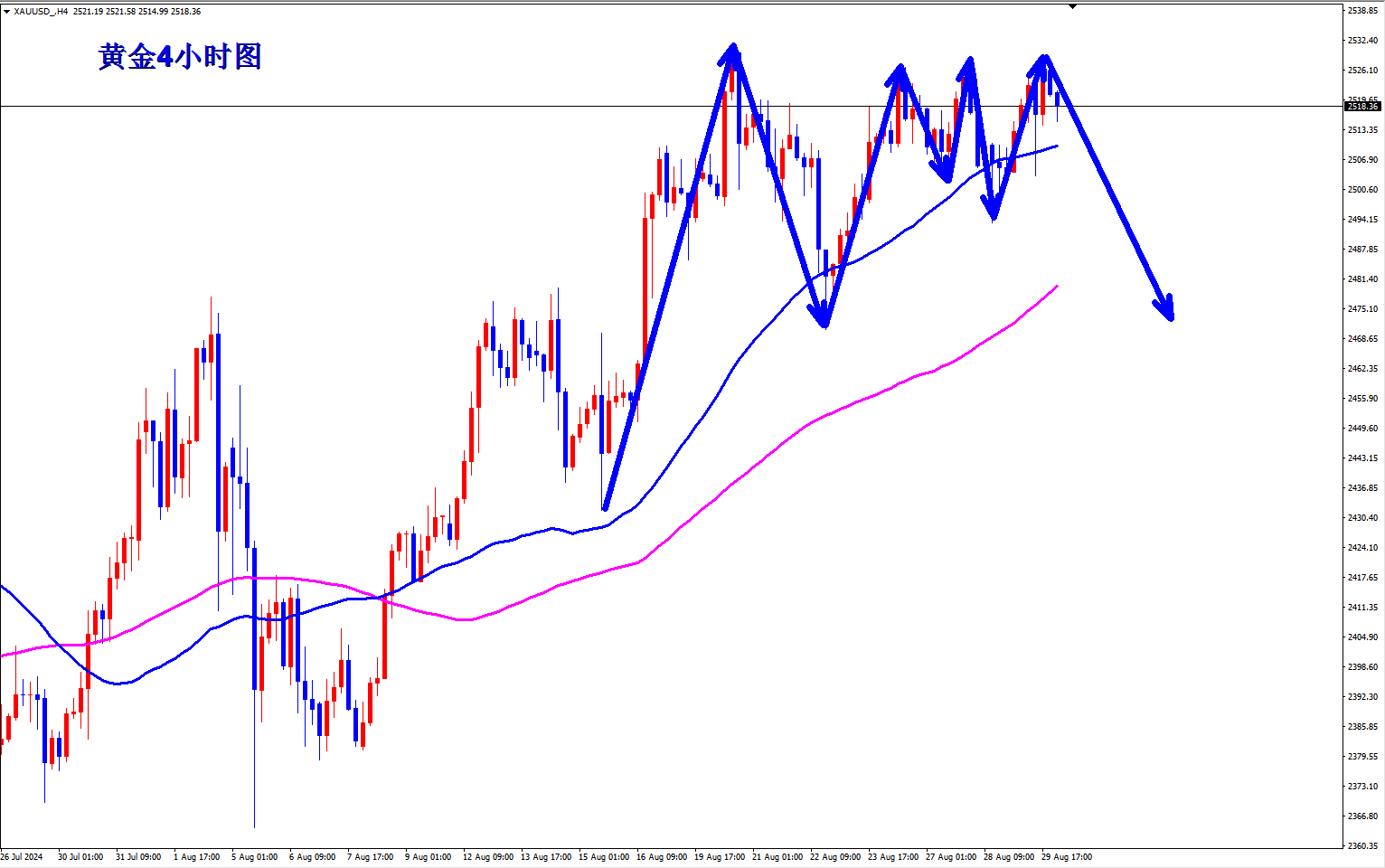 黄金不突破历史新高,那么黄金4小时就是多重顶部结构,黄金反弹继续空,只要黄金不破历史新高,黄金多头趋势就没有延续,高位反复震荡,就反复空就是了,如果黄金突破历史新高,就顺势跟进做多,现在还没有就高位空。