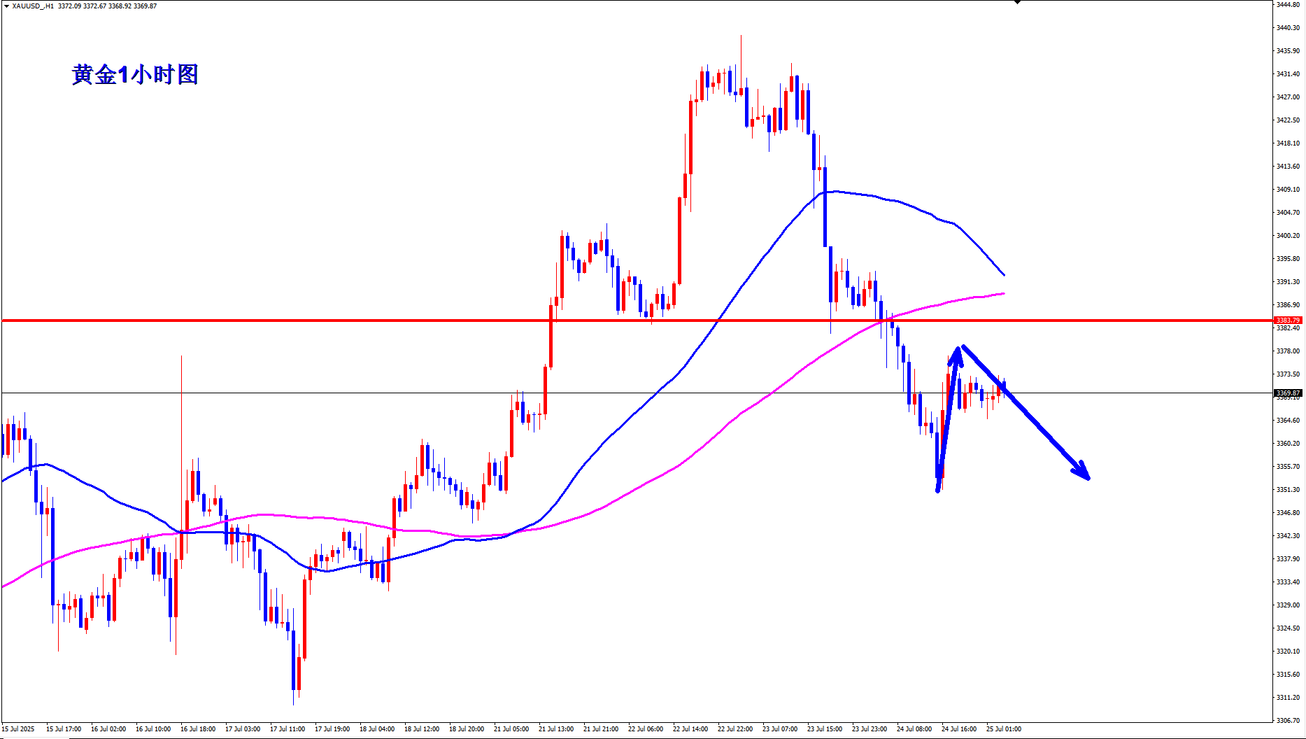 黄金1小时均线继续向下拐头,如果一旦形成死叉,那么黄金下跌空间将进一步打开,黄金将还有下跌空间,黄金昨晚美盘反弹依然承压3383一线阻力,早盘反弹3383下还是继续逢高空,黄金昨晚反弹最高3377一线,如果今天连3377都不能触及,那么就是属于反弹弱势,那么黄金空头将更加如鱼得水。