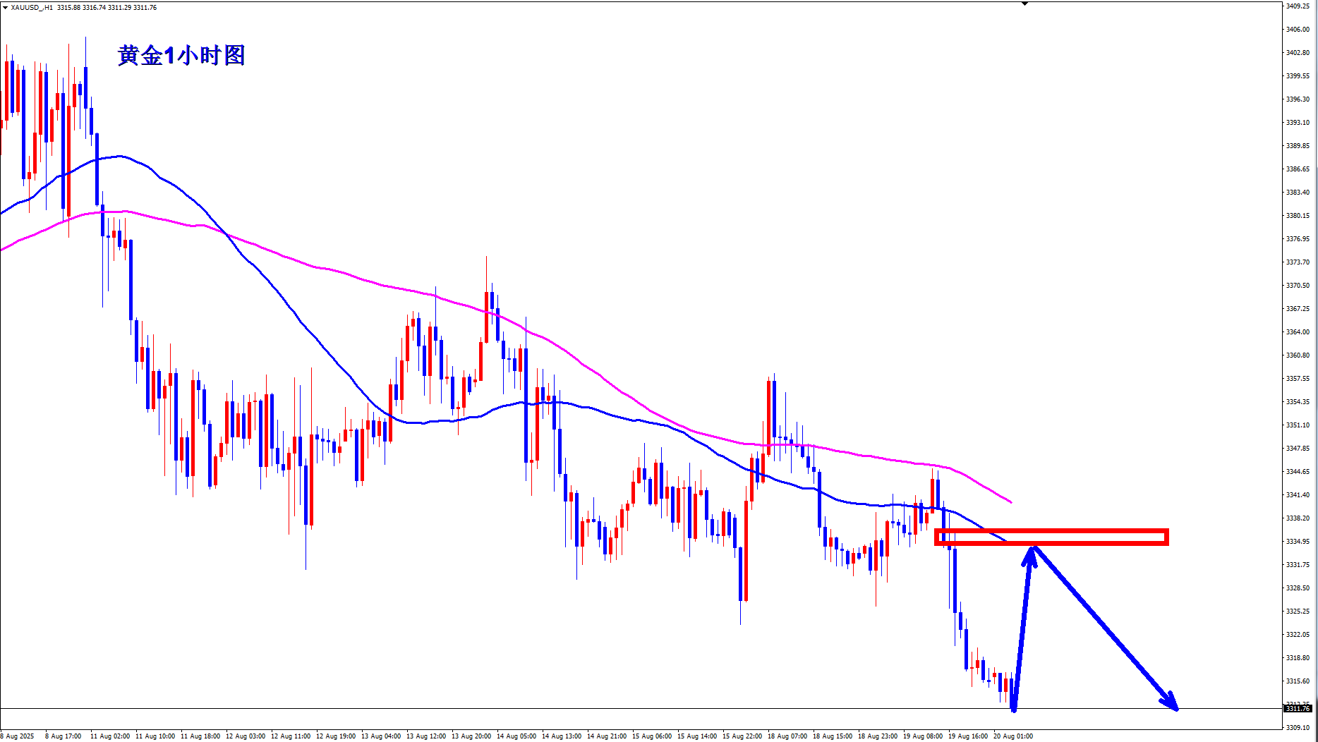顺势轻飘飘,逆势乱糟糟,市场总是对的,跟市场对着干终将被市场所教训,趋势面前不要有任何的侥幸心理,市场不会一次又一次的原谅你的过错。短线黄金空头趋势延续,反弹就是空。