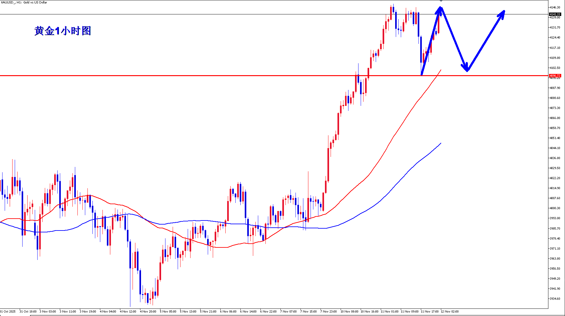 黄金1小时均线依然是金叉向上的多头排列,黄金1小时上涨还有动能,黄金昨晚回踩稍微跌破4100之后快速反抽,说明黄金短线4100支撑依然有效,黄金早盘回踩4100上继续逢低做多,黄金现在依然在为突破4160蓄势。