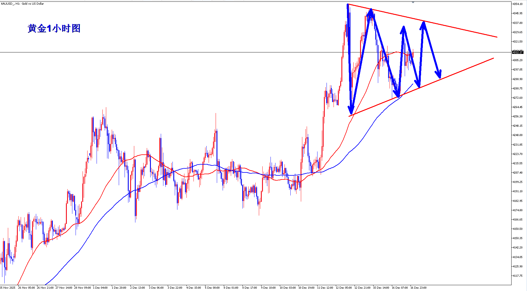 黄金1小时还是大区间震荡,不过黄金震荡的幅度开始收窄,如果黄金最终不能突破昨日的高低点,那么黄金1小时就开始走对称三角形的形态,那么黄金的震荡幅度可能会再次逐步收敛,最终寻求方向突破,黄金上方关注4342阻力,下方关注4280支撑,今天可以在区间内高抛低吸。