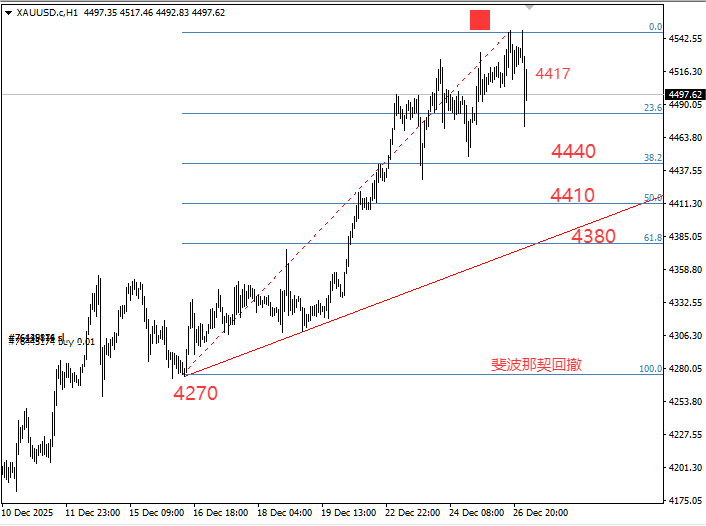 整体来看,4410上方(国内金价993元/克)均可视为短线做多的安全区间,但需警惕关键支撑位4380(国内金价988元/克)的得失。若金价跌破4380,短线上升走势或将暂时告一段落,进入宽幅震荡阶段;不过从日线级别判断,即便下破4380该支撑,中长期上行趋势也未发生根本改变,仅是短期节奏有所调整。