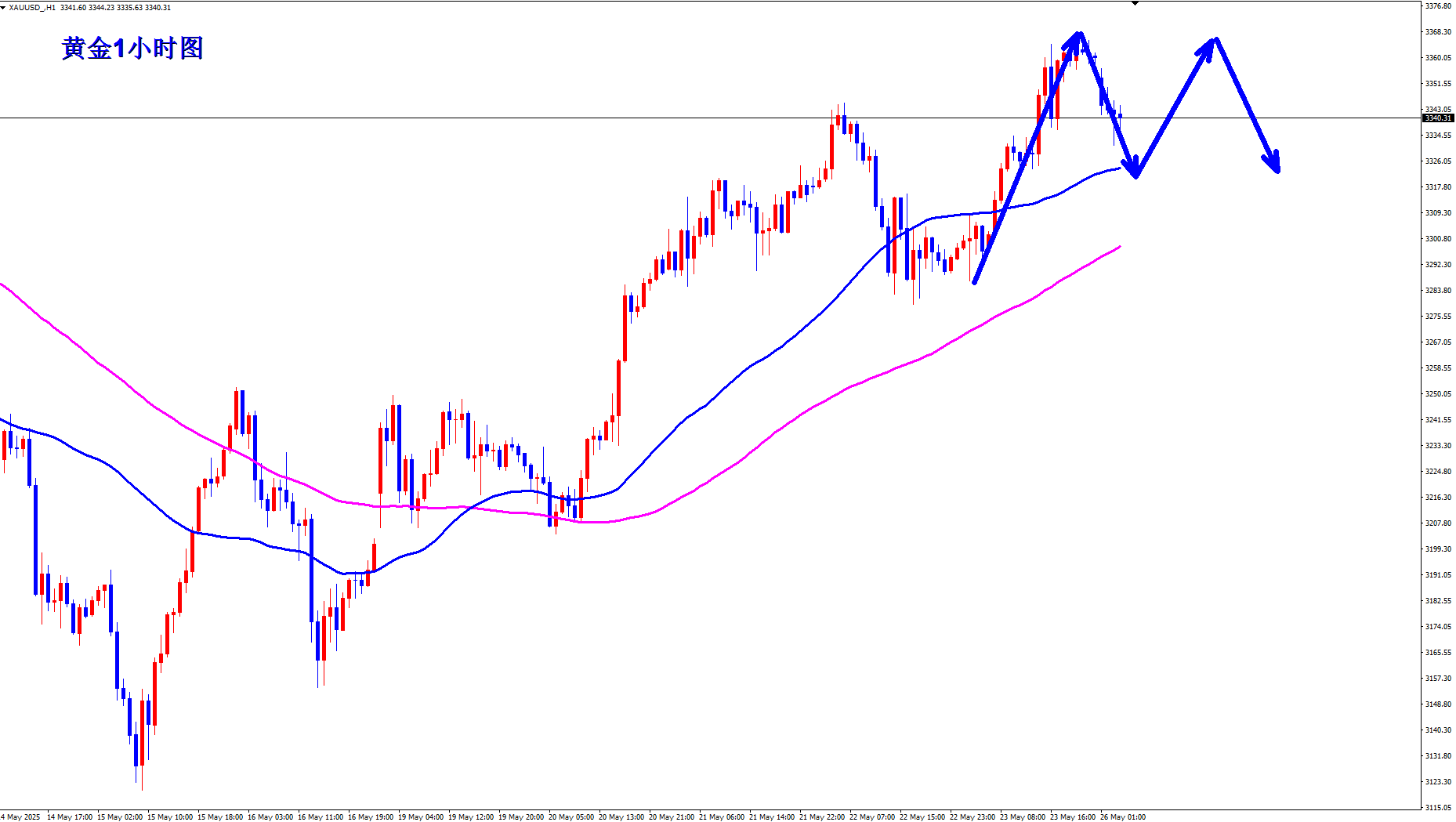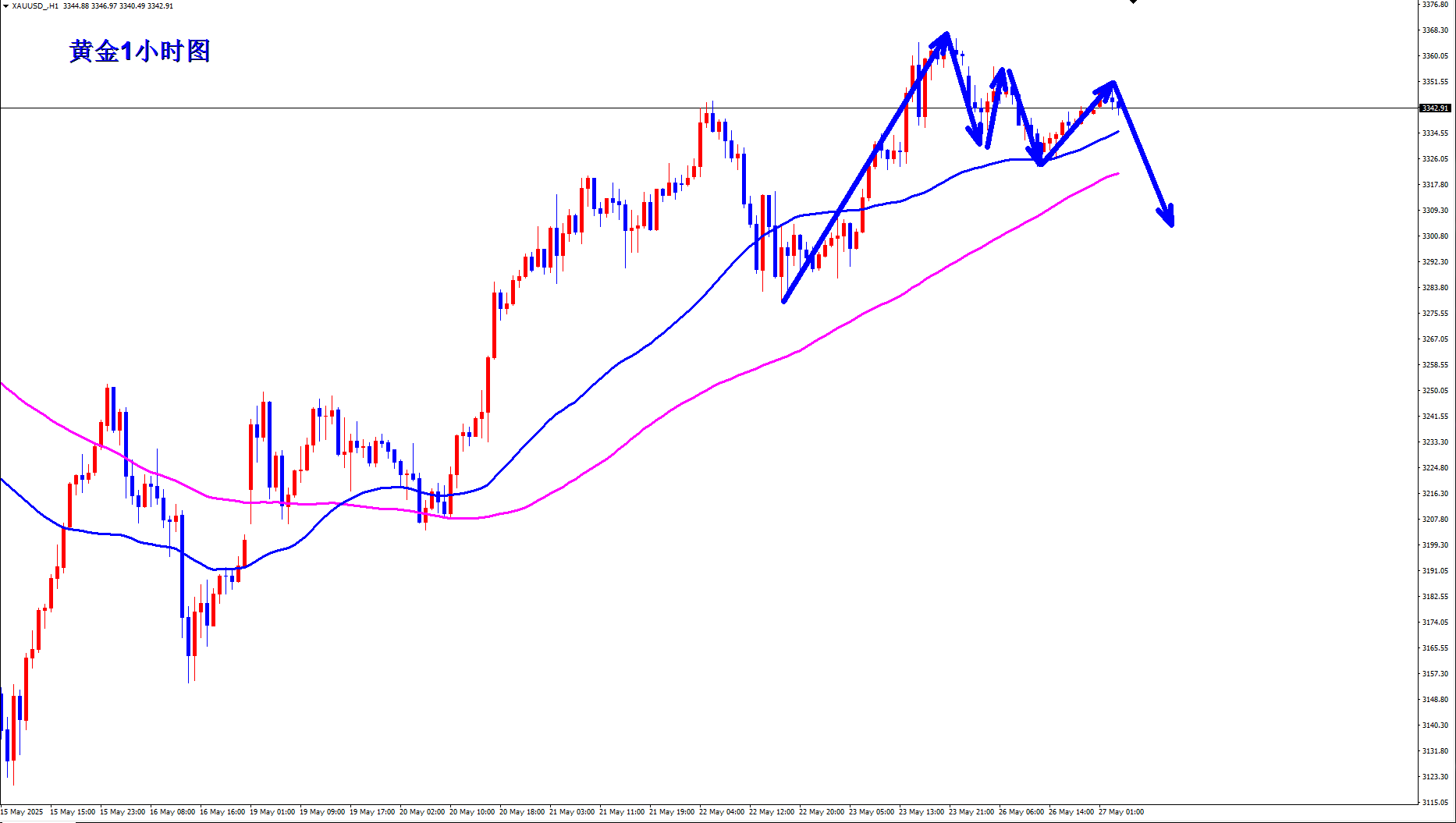黄金昨天持续弱势之后,黄金美盘3310直接反手空,美盘路演也直接公开提示3310直接空,黄金如期下跌,黄金现在开始高位弱势了,那么早盘反弹还是继续空,黄金早盘现价3303可以直接空。 黄金1小时均线已经开始拐头,那么黄金1小时的上涨动能已经减弱,黄金短线开始承压,黄金早盘反弹3308一线就继续回落下跌,那