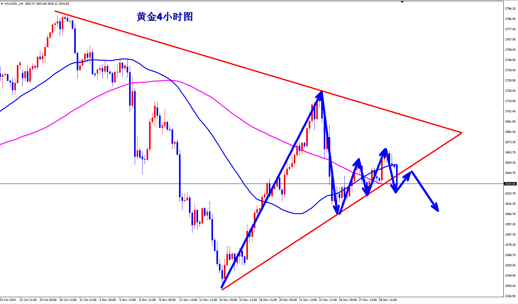 黄金早盘直接下跌破位,黄金多头昙花一现,最终还是黄金空头更胜一筹,黄金早盘反弹继续空。 黄金4小时上周三角形收敛形态,不过黄金早盘直接下破,黄金现在空头打破了平衡,那么黄金现在继续成为空头的主场,黄金早盘2650下继续逢高空。黄金反弹2645附近可以先空起来。 市场瞬息万变,千万不能一根筋