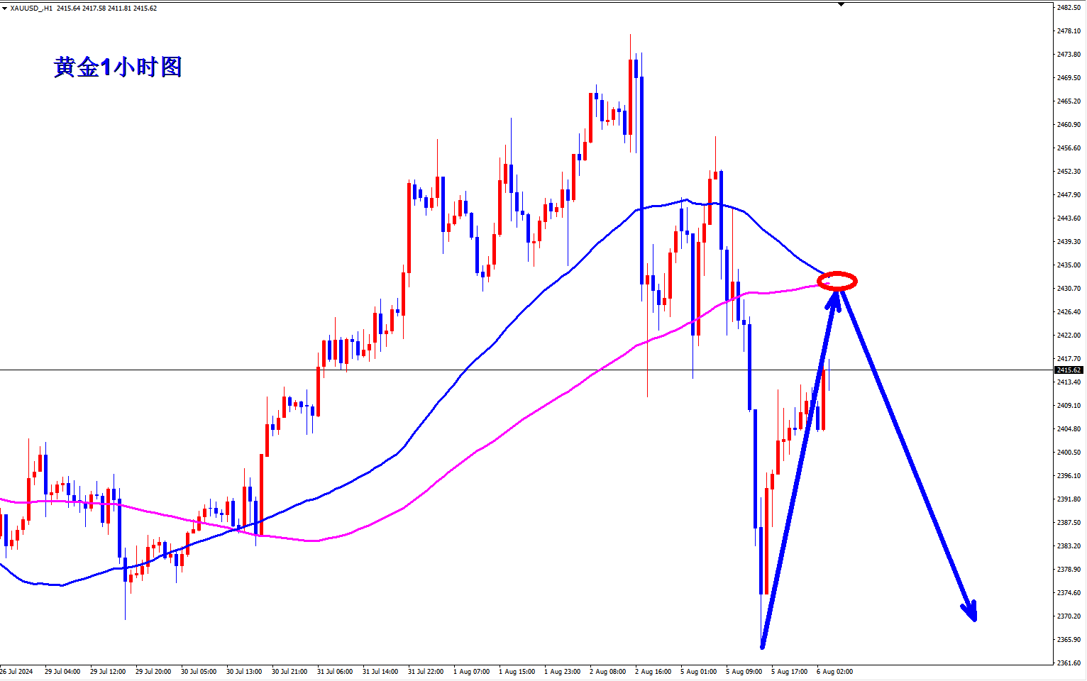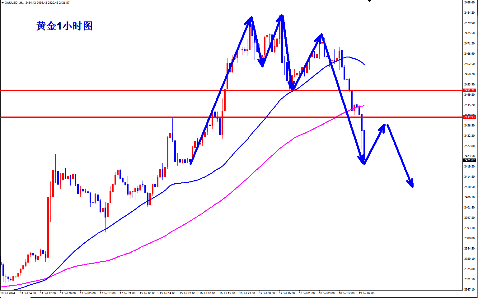 黄金这两天行情大起大落,宽幅震荡,没有持续的大单边行情,这两天就不适合追单边趋势了,不过黄金高位乌云盖顶,黄金高位还是可以继续先干空。 黄金1小时均线即将拐头形成死叉,如果黄金向下形成死叉,那么向下的空间将被打开,黄金还又进一步的下跌空间,黄金均线阻力现在在2432一线附近,黄金如果早盘持续反