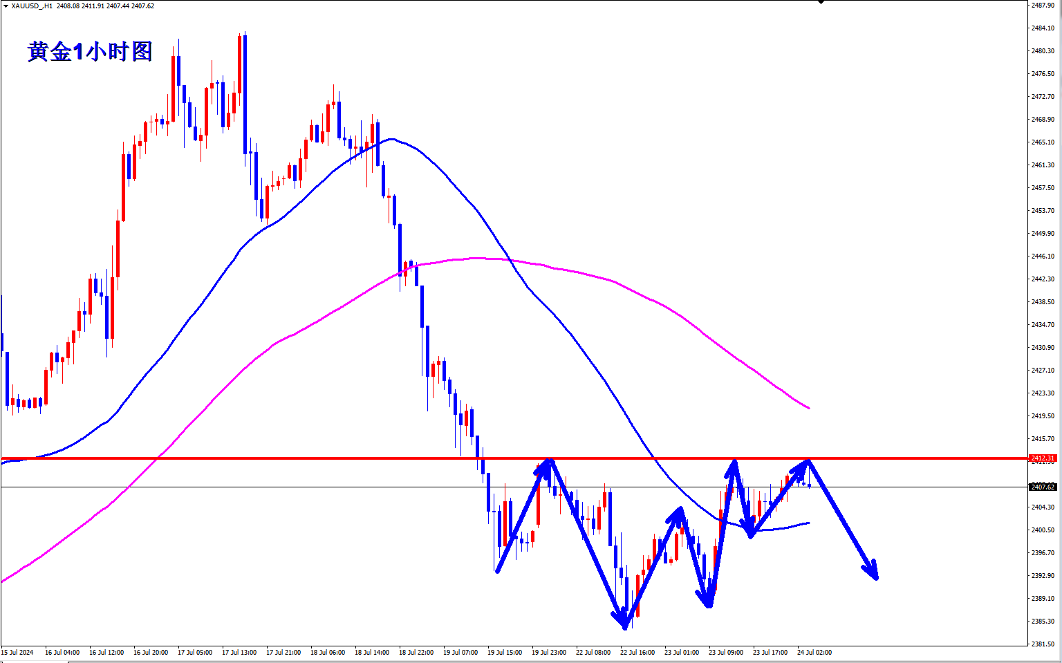 黄金多次冲高回落,黄金多头还是无力回天,黄金还是空头趋势,反弹继续空,耐心等待反弹的高空机会,黄金反弹2400上方继续找机会空。 黄金1小时均线还是死叉向下空头排列,目前还没有任何拐头的迹象,黄金反弹就是给干空的机会,不过黄金这几天行情波动其实挺活跃的,所以不管是下跌还是反弹空间还是挺大的,一