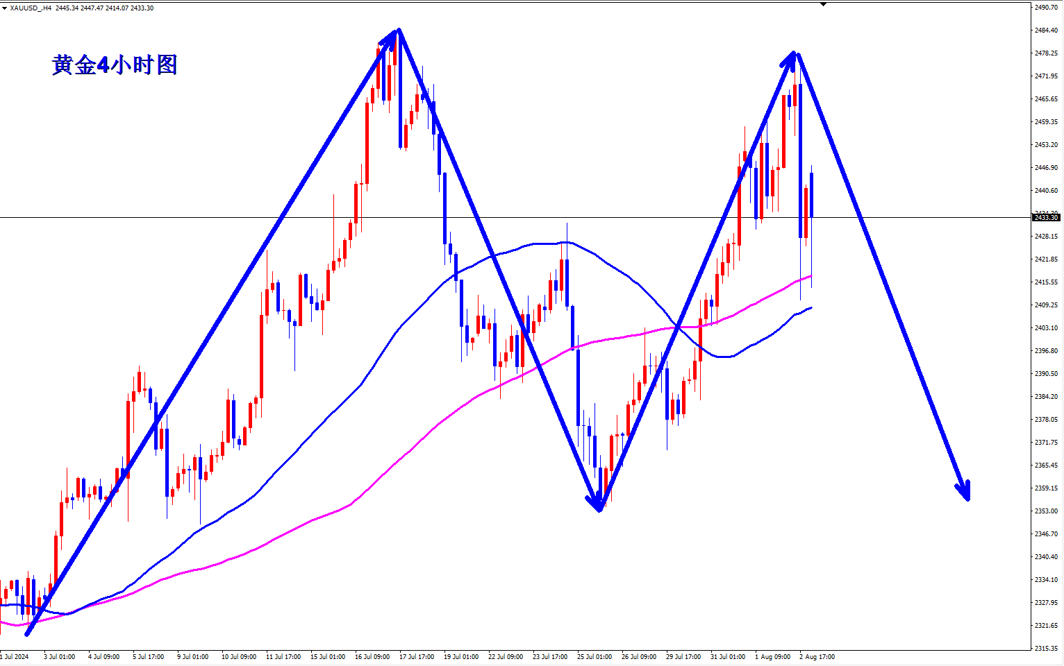 黄金早盘快速拉升之后,黄金再次冲高回落,黄金再次下跌,黄金趋势还是空头,黄金早盘现价2434现价直接空。 黄金4小时还是双顶形态,暂时行情还没有那么快容易反转,黄金还是继续看空头趋势,黄金早盘冲高还是承压2450阻力快速下跌,黄金空头的力度还在,黄金早盘2434可以继续先空起来。 行情瞬息万变