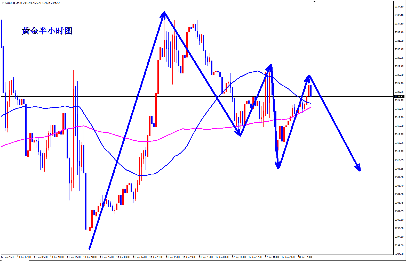 黄金后半夜反弹上来,早盘快速上冲了一下,不过还是止步于2327一线的阻力,黄金短线继续承压,黄金早盘现价2323直接空! 黄金30分钟开始走震荡下跌的走势,黄金30分钟均线也可能再次进入死叉形态,那么黄金就有会继续走弱,黄金短线继续承压昨日反弹高点2327一线,早盘继续在2327下继续逢高干空,早盘现价2323