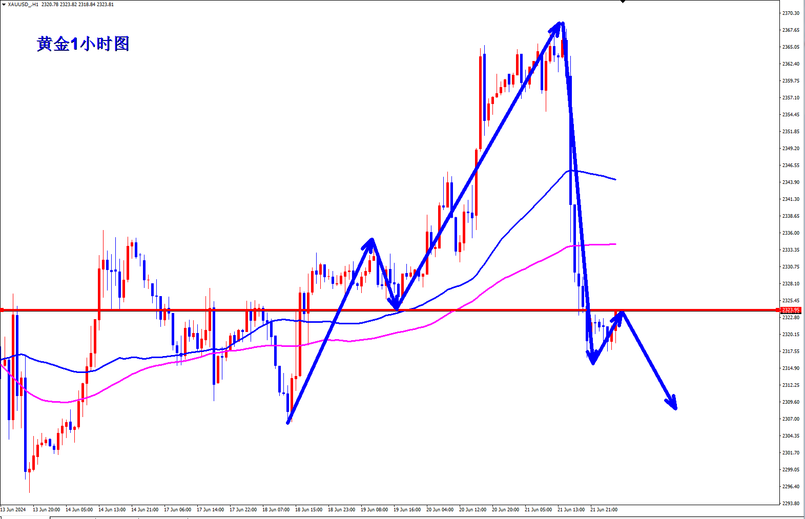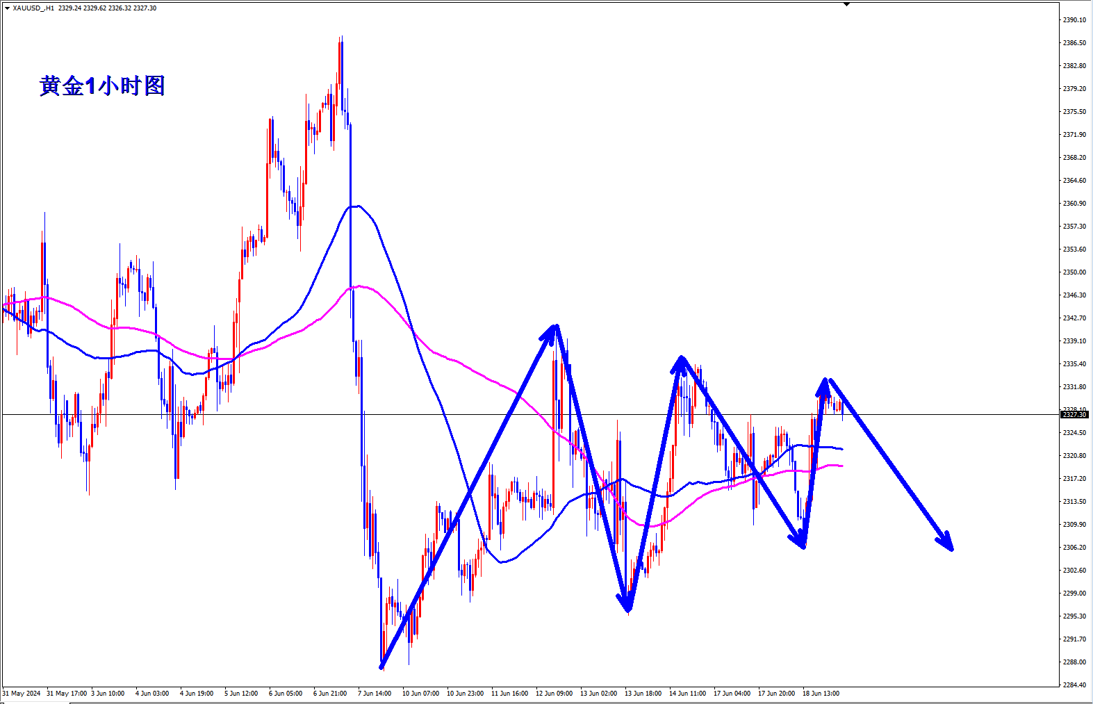 从上周五我们黄金2340开始转空以来,坚持看空,反弹就是给干空的机会,这两天更是说黄金要跌破2300,黄金昨天美盘终于跌破了2300,黄金趋势还是空,早盘现价2300直接空。 黄金1小时均线继续死叉向下空头排列,黄金这两天一直创新低,反弹无力,黄金跌破2300之后基本上没有什么大的反弹力度,可以看出黄金跌破23