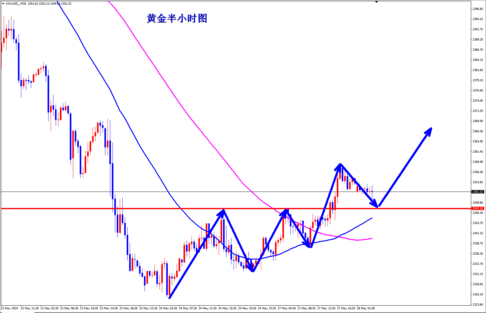 黄金昨日慢涨收阳,黄金短线有望止跌,短线有望继续上涨,早盘顺势继续跟进做多,黄金早盘现价2350直接多! 黄金30分钟图均线开始成金叉向上,黄金多头就开始积蓄了动能,黄金30分钟前两日一直受阻承压2347一线阻力冲高回落,不过昨晚美盘强势突破,那么黄金2347一线短线就成了支撑,黄金今天在2347上逢低都是