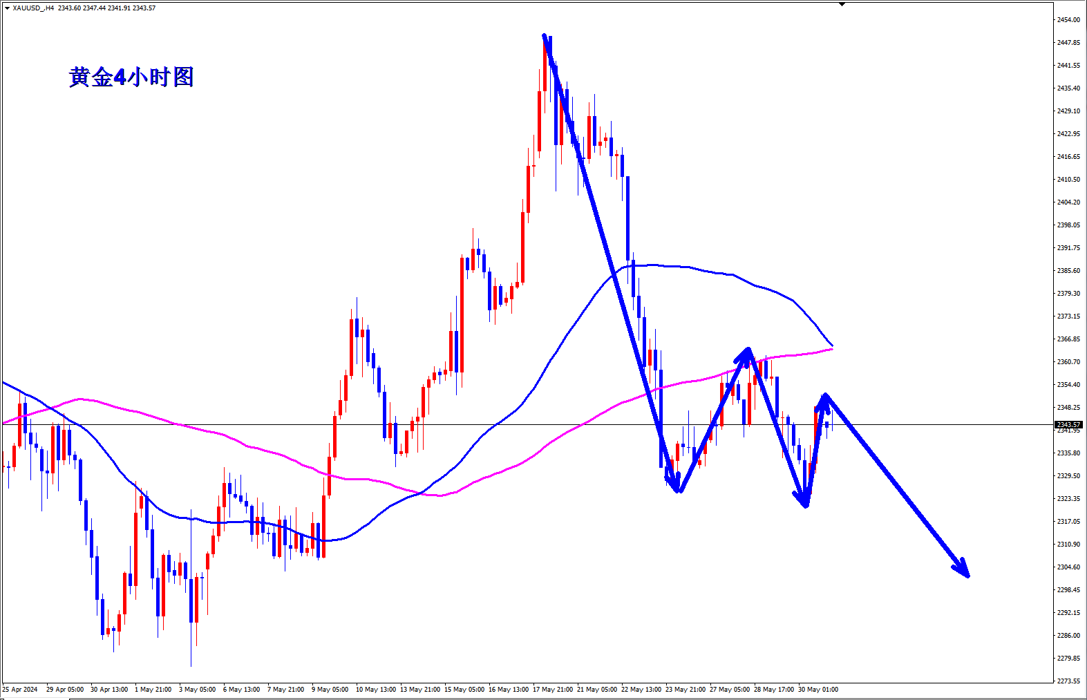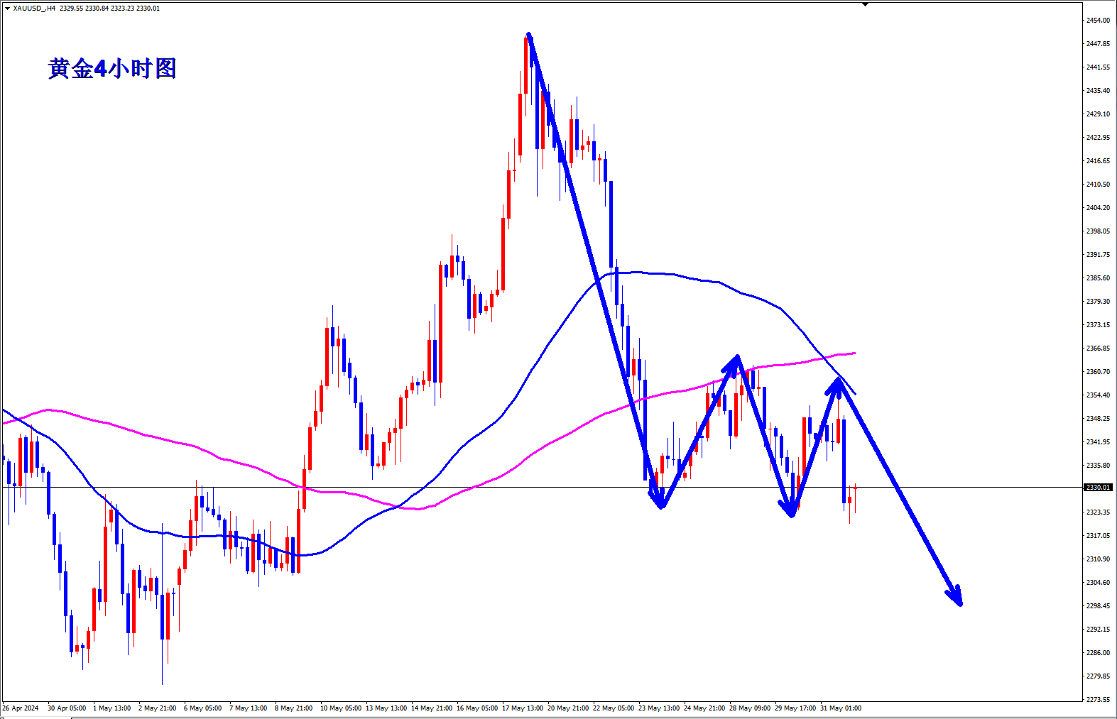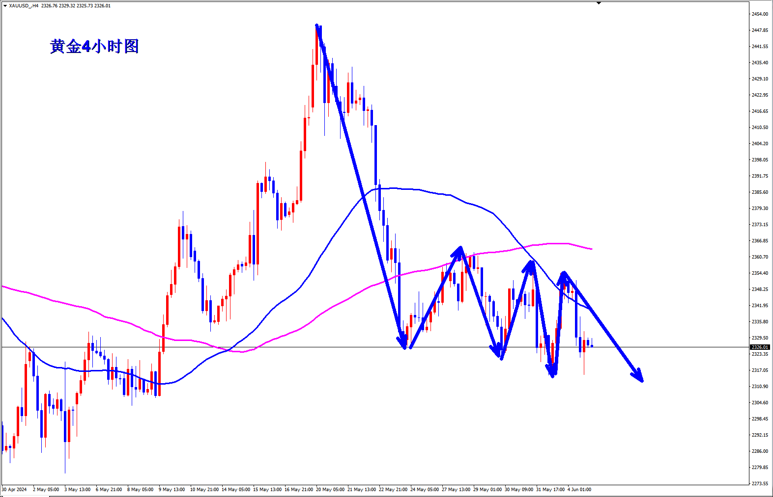 黄金上周五直接再次跌破新低,黄金空头趋势还将继续,远远还没有结束,黄金早盘现价2331直接空! 黄金4小时图均线继续死叉向下,开口张大,黄金下跌还有空间,黄金周五大跌之后反弹2336附近直接再次大跌破位新低,今天在2336下都是逢高给干空的机会,早盘现价2331直接先空起来。 顺势轻飘飘,逆势乱糟