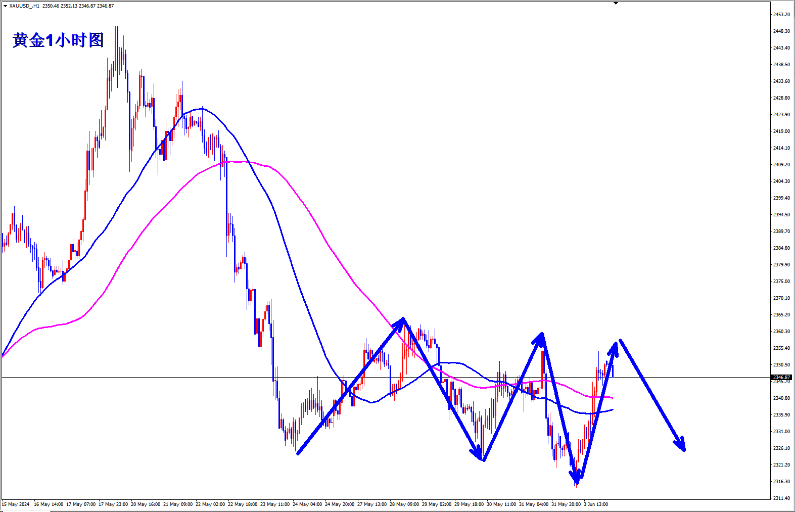 黄金2361开始干空,黄金2359还是干空,昨晚美盘2343继续干空,昨晚美盘路演也直接公开提示2344干空,黄金下跌收割,黄金干空再次斩获三连胜。黄金反弹无力,趋势还是空,早盘反弹继续干空。 黄金1小时并未站稳均线,黄金均线还是拐头,而且再次跌破均线,黄金均线阻力附近继续干空,黄金均线阻力现在下移到2345
