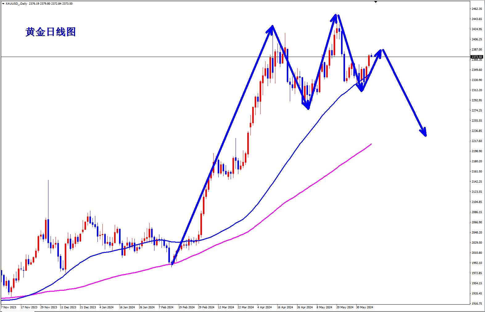 今天非农,大行情终于要来了,黄金看着很强势,不过数据前还是不要追多。数据前还是先看调整,今天早盘和昨天早盘有一点不一样就是今天早盘上冲力度明显减弱,而且快速被压制,冲高回落。 黄金日线图要小心出现头肩顶结构,黄金如果今天冲高回落,那么黄金日线头肩顶结构就成立了,黄金早盘冲高到2380附近就直