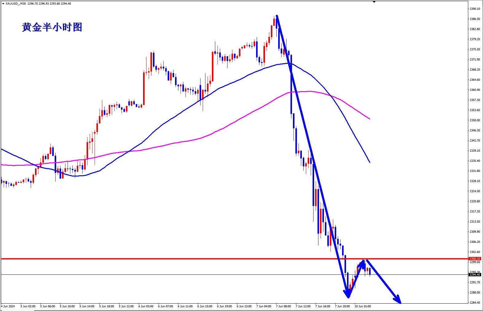 黄金周五大跌,破位2300,黄金反弹弱势,黄金日线高位乌云盖顶,早盘反弹继续顺势空。 黄金30分钟均线死叉空头向下,开口逐渐张大,黄金空头还有力度,黄金下跌还远远没有结束,黄金早盘反弹2301附近就直接开始继续下跌,黄金反弹弱势,早盘反弹2300附近直接可以干空。 顺势轻飘飘,逆势乱糟糟,黄金