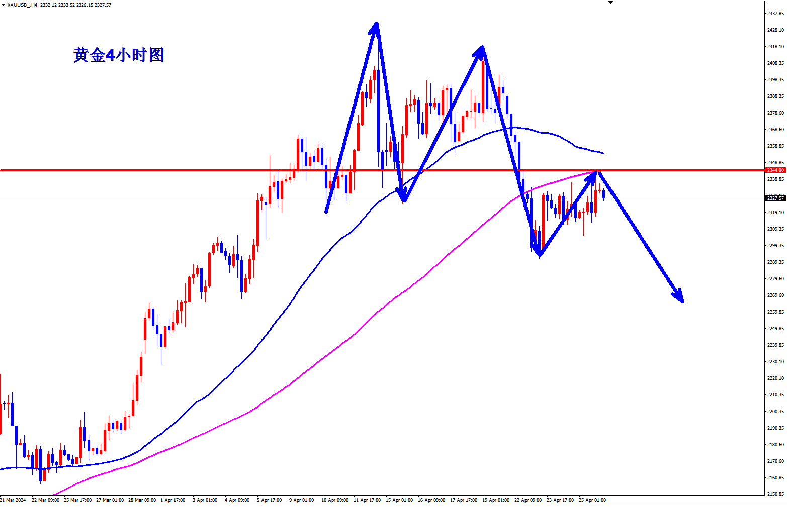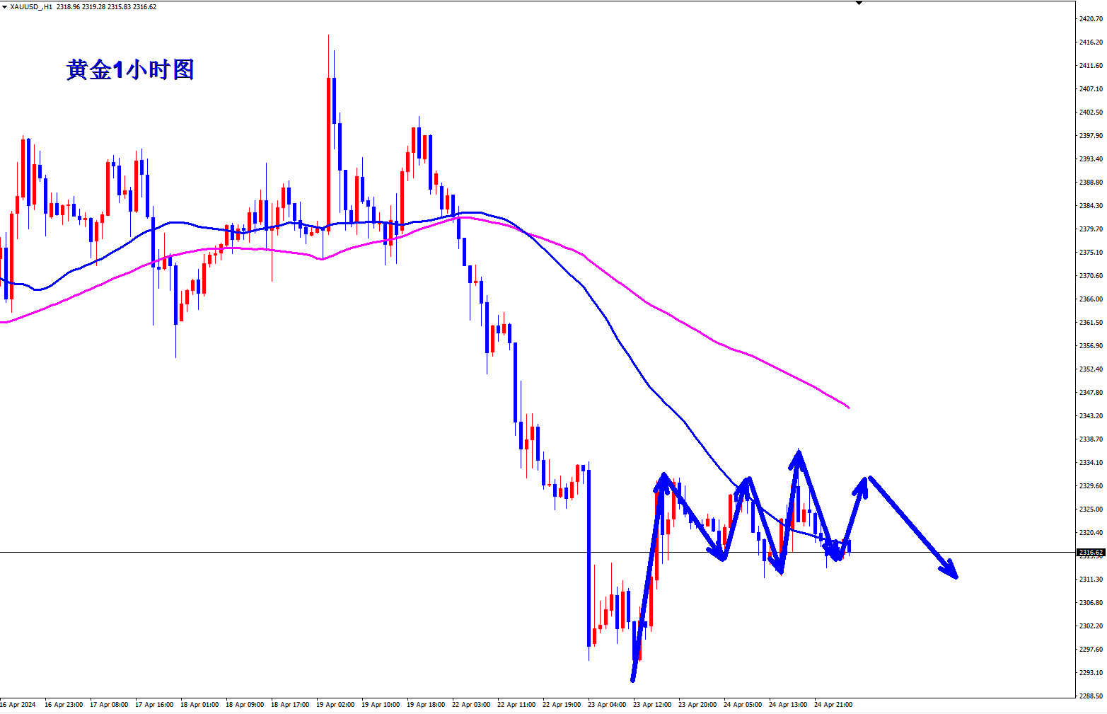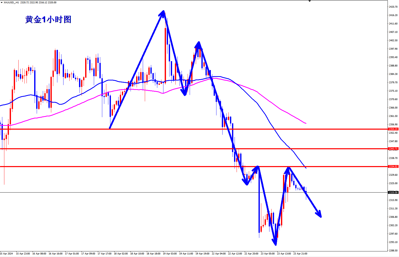 黄金昨天继续大阴线下跌,黄金空头远远还未结束,今天反弹还是继续干空,黄金昨天一路下来,多头基本上没有什么反弹力度,无力反攻,空头继续主导市场,早盘黄金反弹继续干空。 黄金4小时双顶结构,现在1小时均线死叉向下空头排列,而且开口张大,黄金下跌还有空间,黄金昨天美盘反弹最高2343一线,黄金反弹234