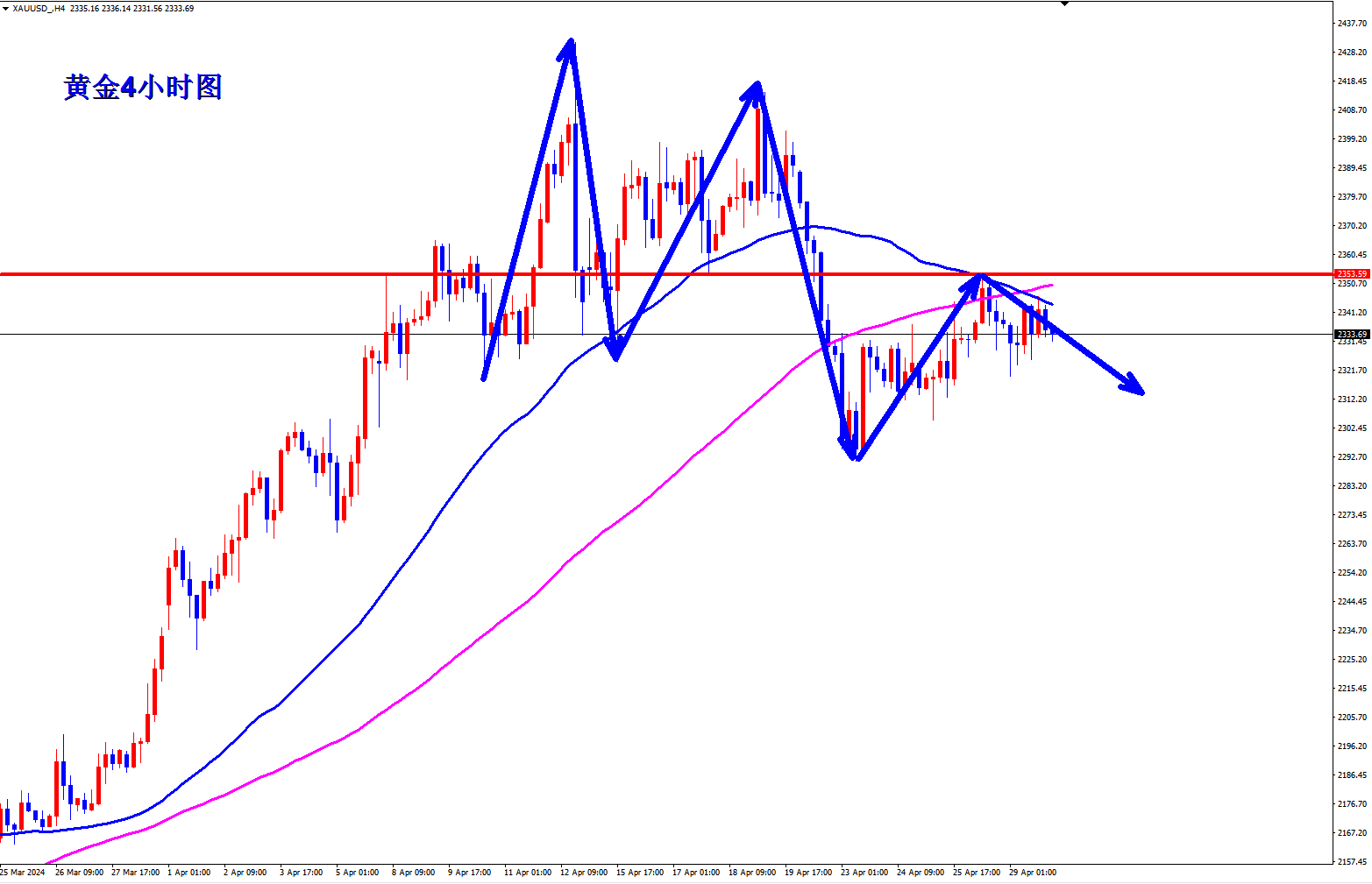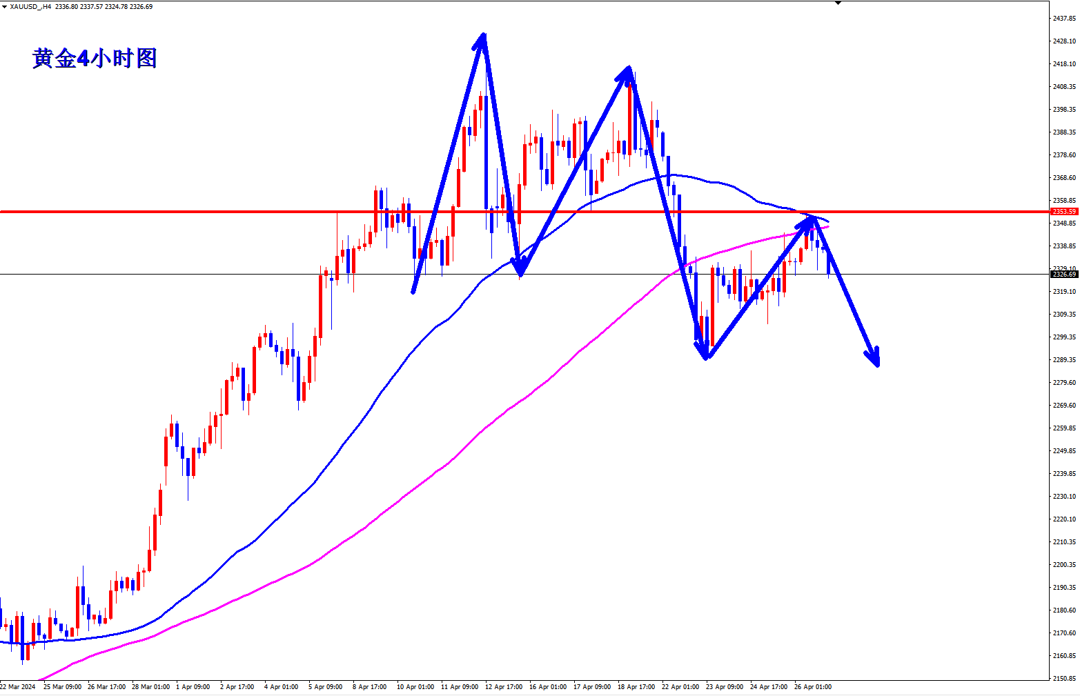 黄金多次冲高回落,说明上方阻力重重,黄金多头动能还是不足,黄金弱势格局还是没有改变,早盘2335现价直接空! 黄金4小时均线还是死叉向下,黄金4小时也依然受双重顶的压制,黄金每次反弹都是快速的冲高回落,上涨并不持续,一而再,再而衰,三而竭,黄金多次上攻不持续,消耗掉了多头动能,一旦多头失去了抵