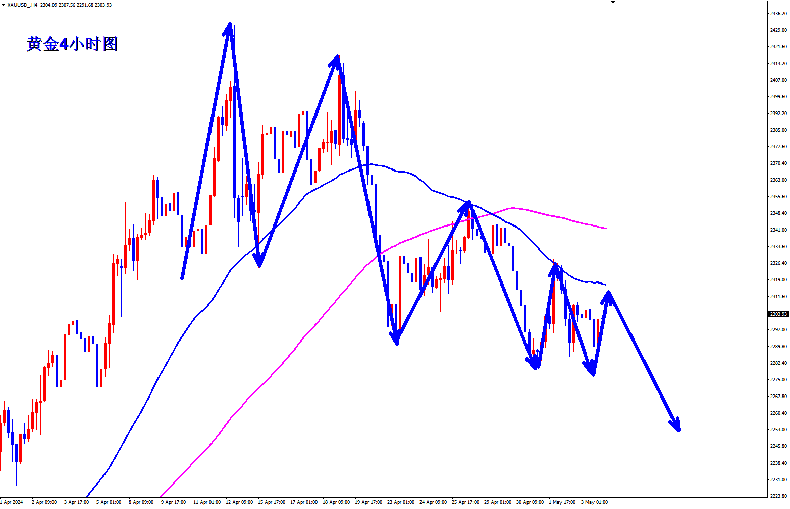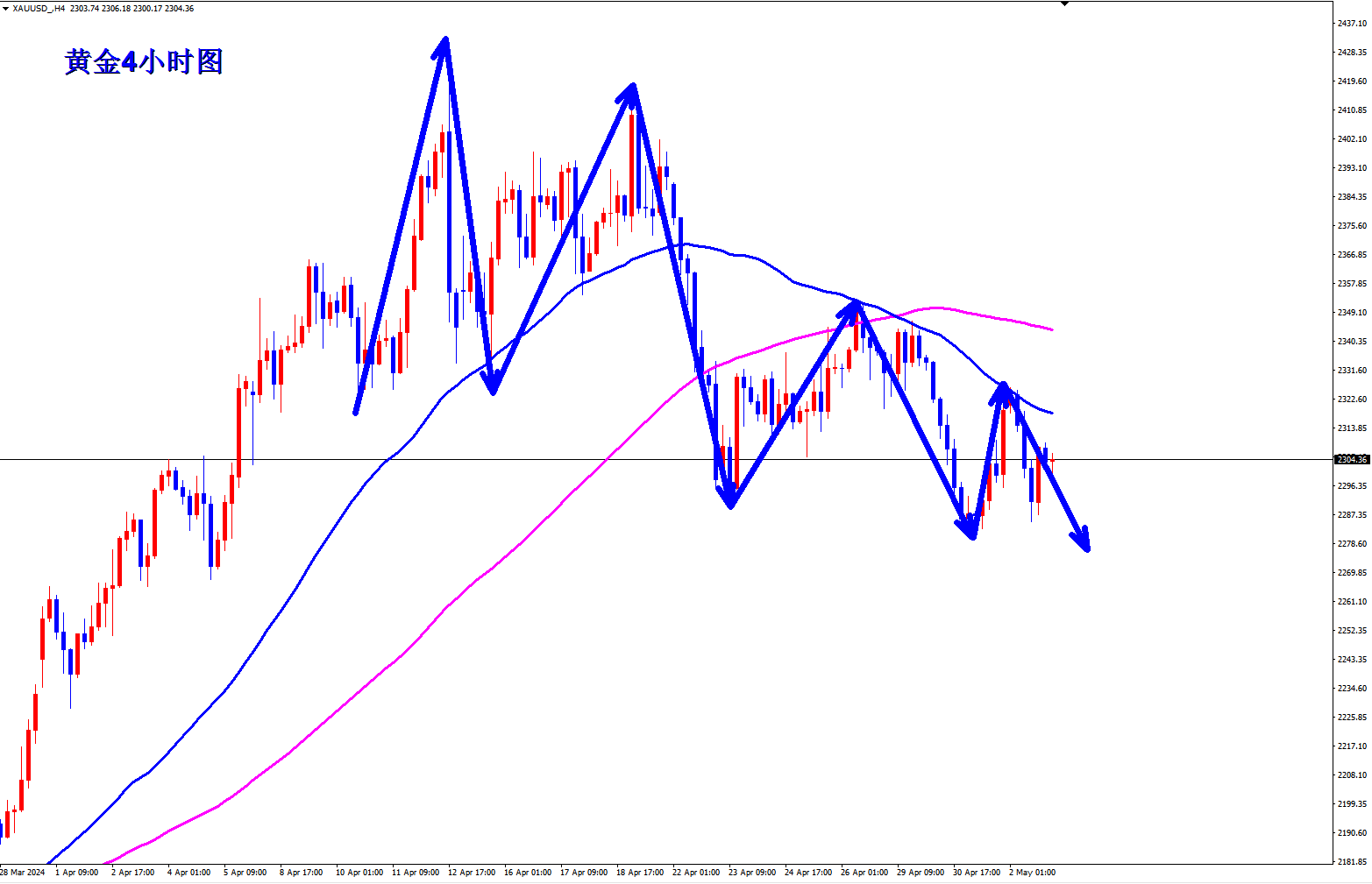 黄金早盘又直接快速下跌,黄金反弹无力,趋势还是空头,早盘反弹继续空。 黄金4小时双顶压制黄金上涨,4小时均线即将死叉,形成死叉后黄金下跌就加大力度。黄金周五二次反弹高点2342附近,早盘2342下继续逢高空,趋势继续由空头掌控。 行情瞬息万变,黄金多头反弹无力,动能不足,反弹高点依次降低,