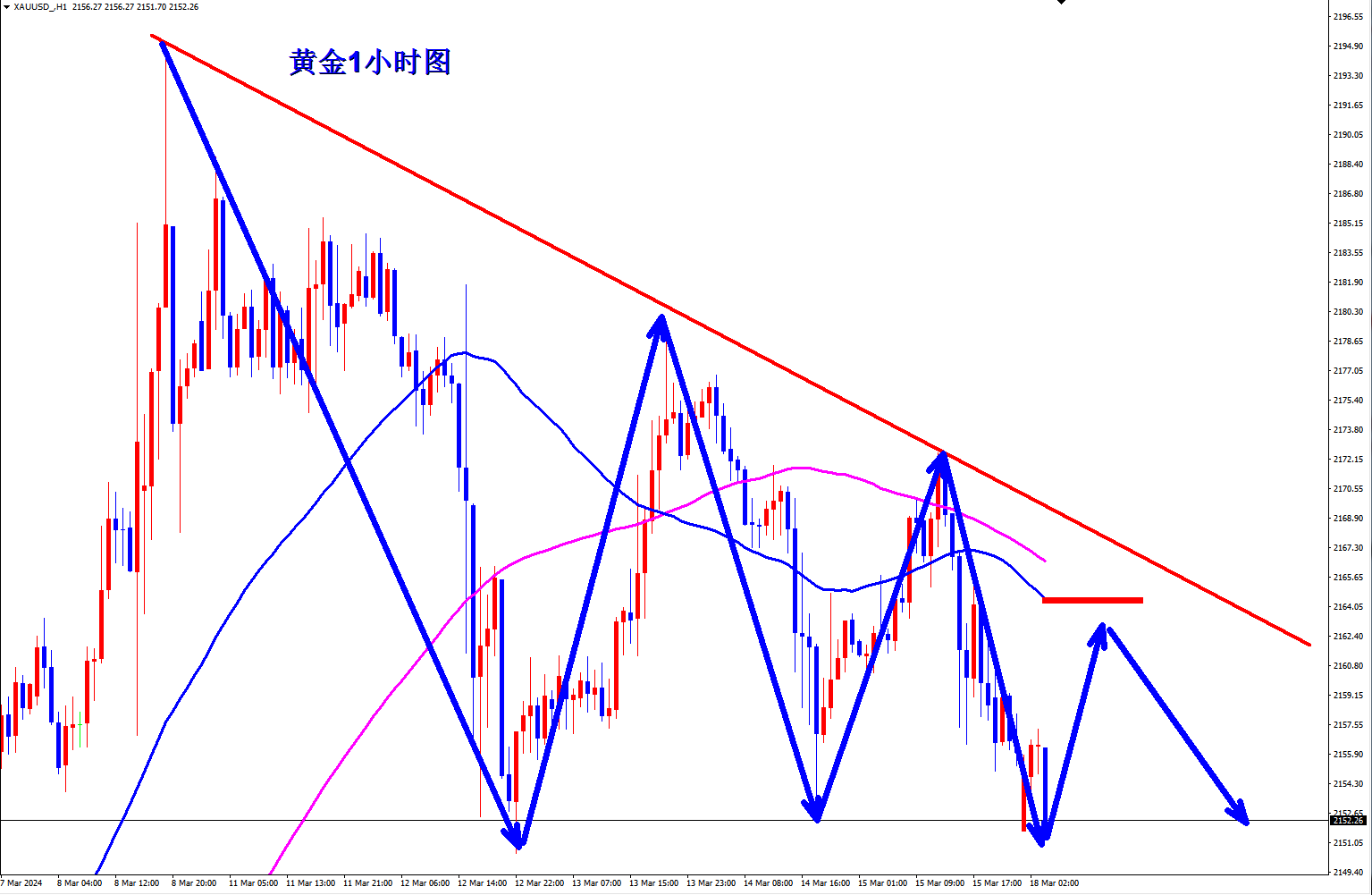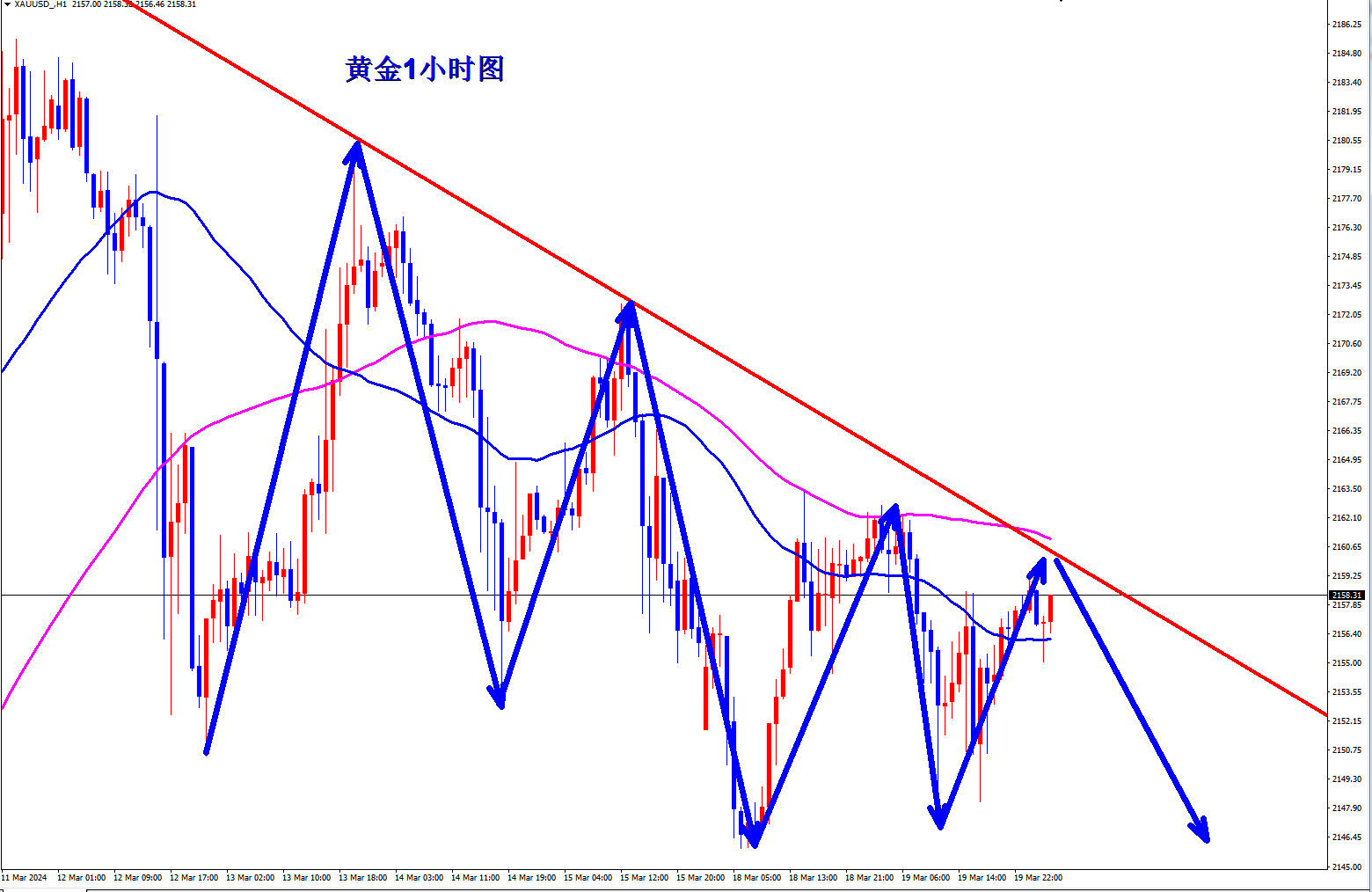 黄金还是震荡,现在反弹上来就是继续干空,黄金早盘现价2158直接空! 黄金1小时均线继续空头向下发散排列,还是受压1小时下行趋势线压制,黄金1小时下行趋势线压制现在在2160附近,早盘2158可以先空起来。 方向不对,努力白费,方向对了,事半功倍。黄金短线继续空头趋势,顺势而为,反弹就是给干空的