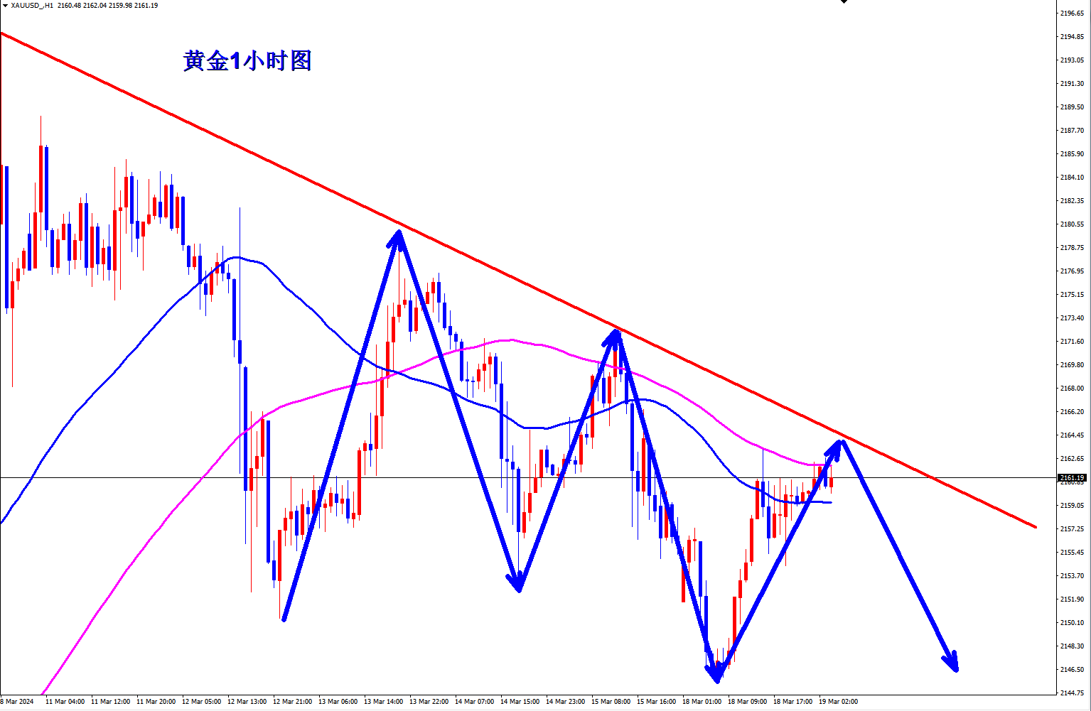 黄金昨天创新低之后黄金又反弹上来了,而且再次突破了2160,黄金最近行情的延续性太差,黄金是反弹还是反转呢? 黄金1小时走势还是在下行趋势中,黄金下行趋势线阻力在2165附近,今天还是反弹继续干空,黄金2165下继续高空为主,黄金早盘现价2162附近可以直接先空起来。 交易你的计划,计划你的交易,