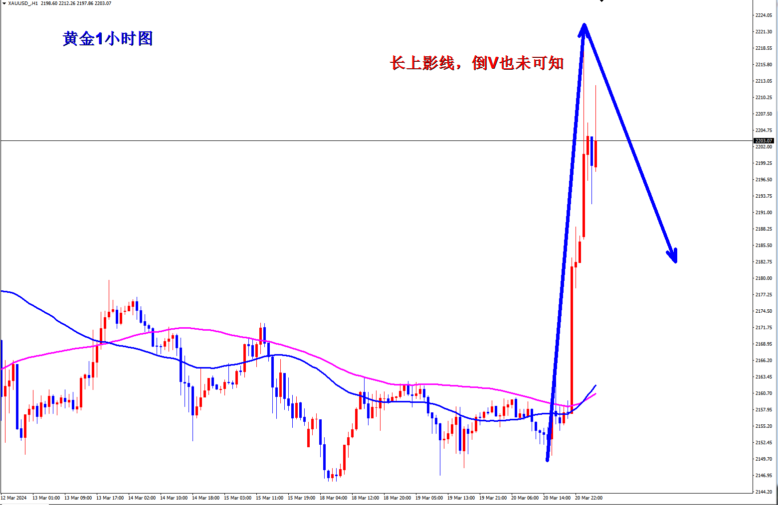 黄金昨日冲高回落,黄金一日游的行情,黄金短线已经见顶了,昨天我们一直强调,黄金早盘急涨就是见顶的信号,历史行情都是历历在目,黄金多少次都是早盘快速上冲之后回落然后就飞流直下,黄金早盘现价2185直接空! 黄金1小时我们昨天给出了一个倒V的走势,黄金果然也是如期走出了个倒V的形态,黄金昨天早上起涨