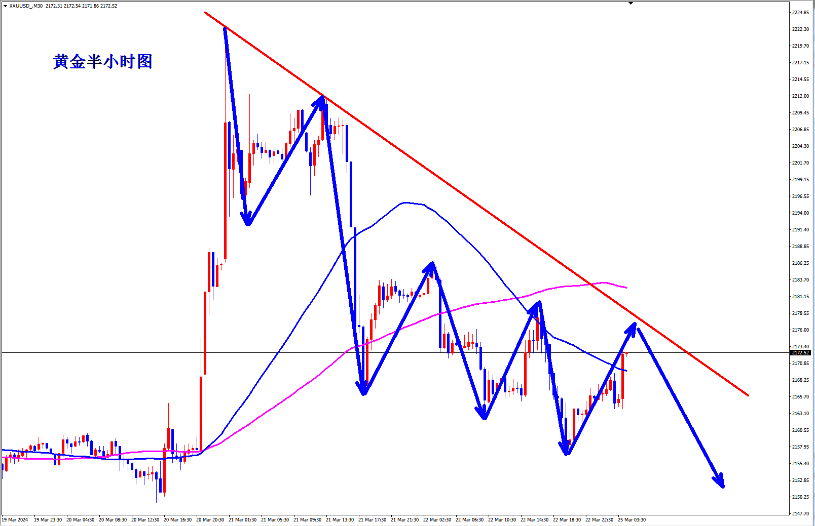 黄金早盘开始反弹,不过黄金短线空头趋势不变,反弹就是给我们干空的机会,黄金早盘现价2175直接空。 黄金半小时图均线死叉空头形态,而且还受下行趋势线的压制,黄金趋势线阻力现在下移到2177附近,早盘反弹2177下方都是逢高给干空的机会,黄金早盘现价2173可以先空起来。 交易之道就是要摒弃个人喜
