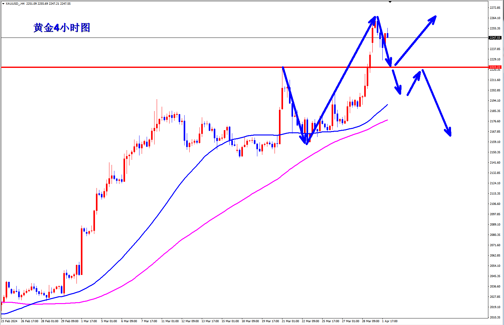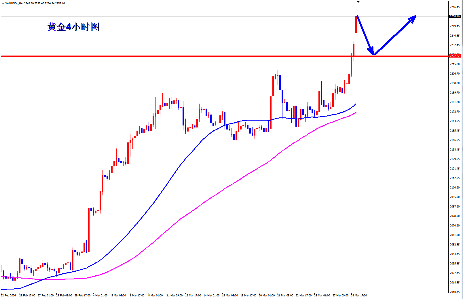 黄金早盘再次急涨,不过现在直接追多也还是需要谨慎,不过黄金再次创出历史新高,而且现在避险情绪比较浓烈,多头还有空间。 黄金4小时均线开始拐头,黄金突破历史新高2222后,黄金2222成为短期支撑,黄金回落2222上方都是逢低干多的机会,黄金回落2230附近可以先多,然后看黄金上涨继续创新高。 市场