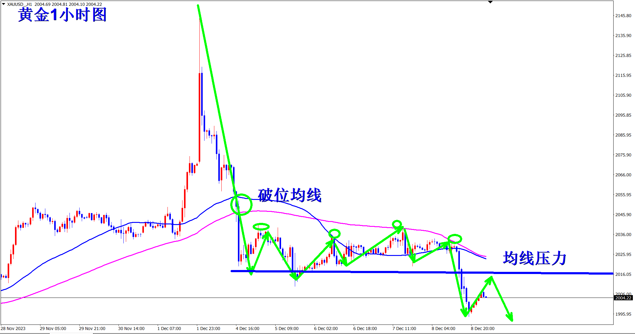 黄金当前开启新的下跌波段,而且是大波段!上周王杨反复提示依托2040压力干空,周五行情大跌,获利颇丰!顺势轻飘飘,逆势乱糟糟!当前黄金跌势继续,早盘依托2015的压力继续干空! 黄金当前明显的跌势,反弹都是干空机会!当前压力2015位置!1小时级别上,黄金自破位均线支撑后就开启了下跌走势!此前的反弹也