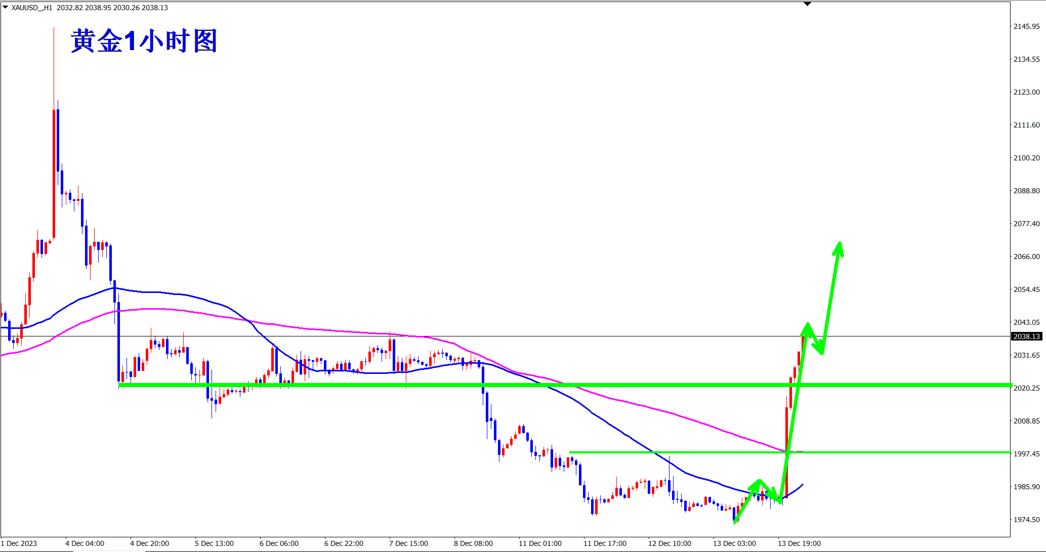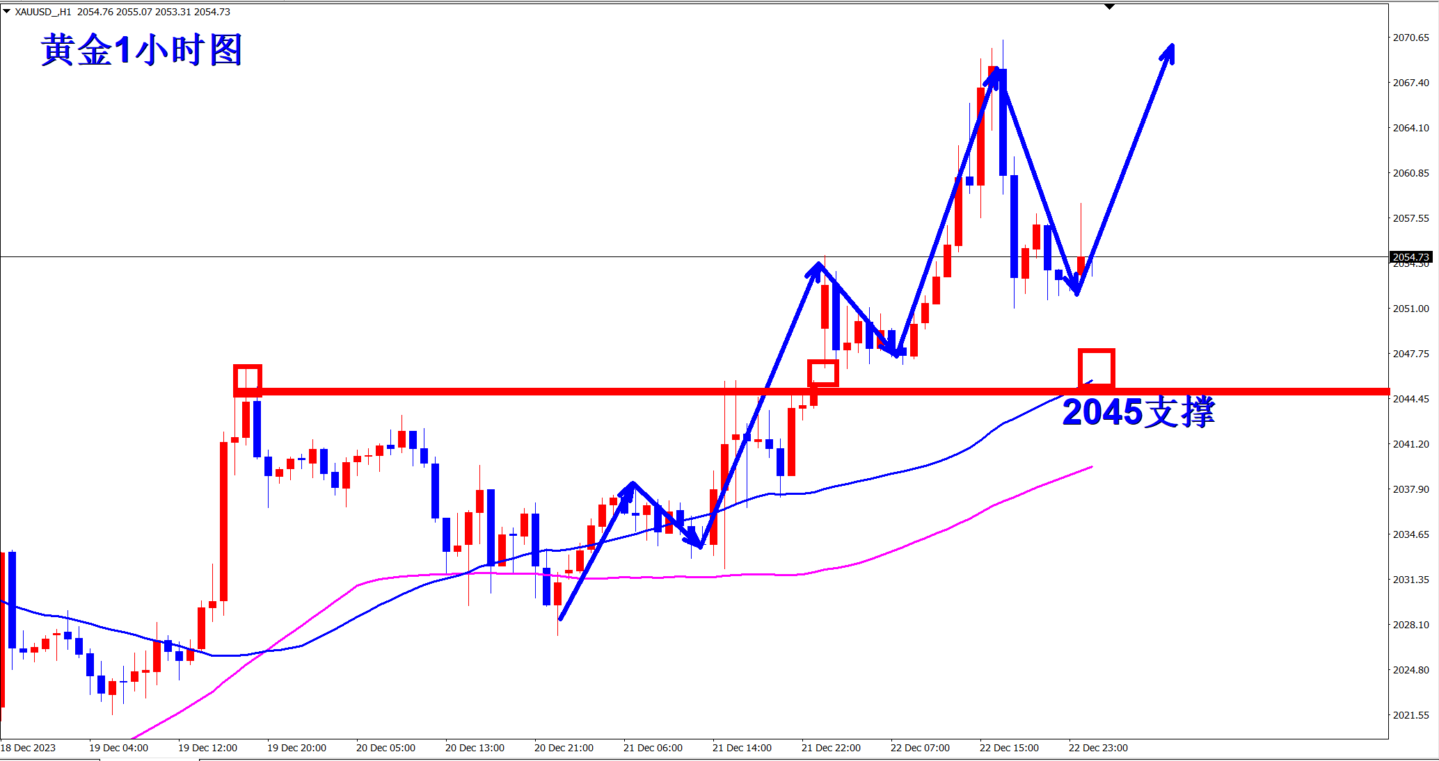 黄金上涨继续上涨突破了近期新高,我们顺势做多再次拿下三连胜!顺势轻飘飘,逆势乱糟糟!今日继续将做多进行到底,早盘依托2045的支撑继续干多看涨! 黄金当前明显的上涨趋势,1小时级别上,黄金维持在均线上方运行,而且突破新高!当前的有效支撑就是前高2045位置和跳空缺口以及均线三点共线的位置!这也是今