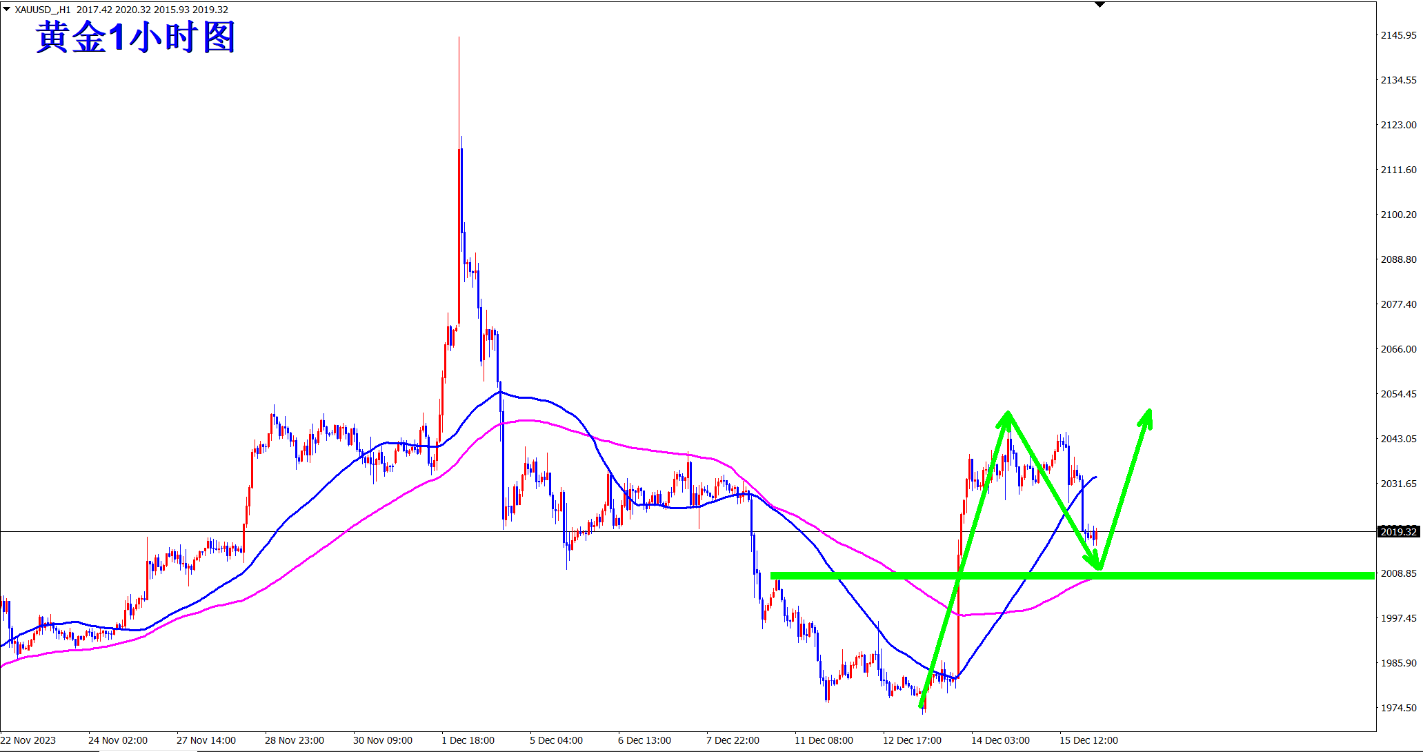 黄金下跌依旧站稳均线支撑上方,上涨趋势没有改变,早盘依托2008的均线支撑继续干多!看涨新高! 黄金周五虽然跳水,但还是站稳在1小时级别长期均线上方,没有破位,就还是多头!当前的多空分水岭是2008位置,此位置上方还是继续干多,而且回调正是再次干多的良机! 早盘依托均线支撑继续干多看涨,上