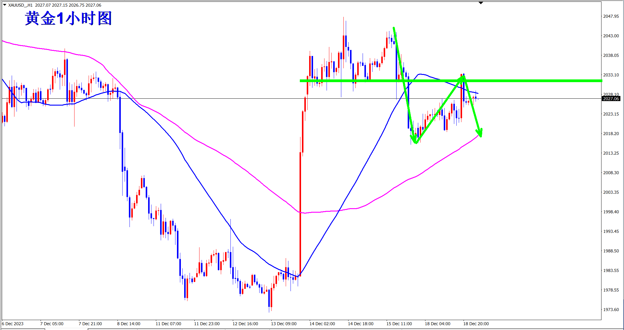 黄金当前区间震荡,昨日最高反弹2033一线后快速回落,说明本次反弹上方阻力重重,早盘依托2033的压力干空看跌,下方关注2010支持! 黄金上周高位震荡后破位,上涨趋势发生改变!当前1小时级别上看,黄金虽然受到长期均线的支撑反弹,但上方遇阻短期均线的压力,多头力度减弱!今日早盘如果不能突破2030的压力,