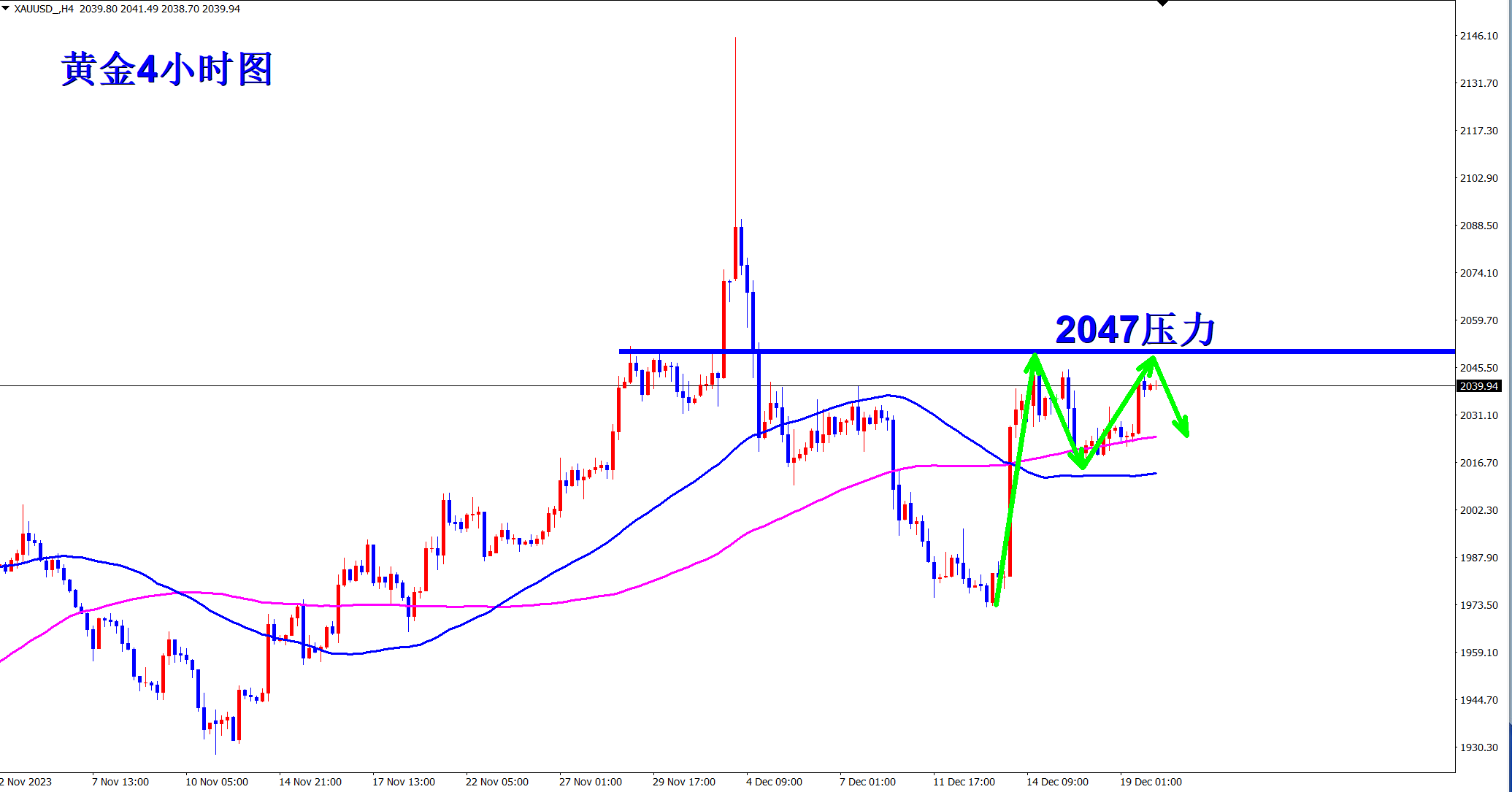 黄金昨日看似强势上涨,但还是止步于前期反弹高点2047一线!当前遇阻,黄金有回调需求,早盘依托2047的压力干空! 黄金从4小时级别看,当前的反弹已经到了前期的盘整压力位置,一鼓作气,再而衰,三而竭!黄金已经连续两次冲击失败,多头力度耗尽!接下来要走回调,下方关注2020位置的支撑! 强不再强