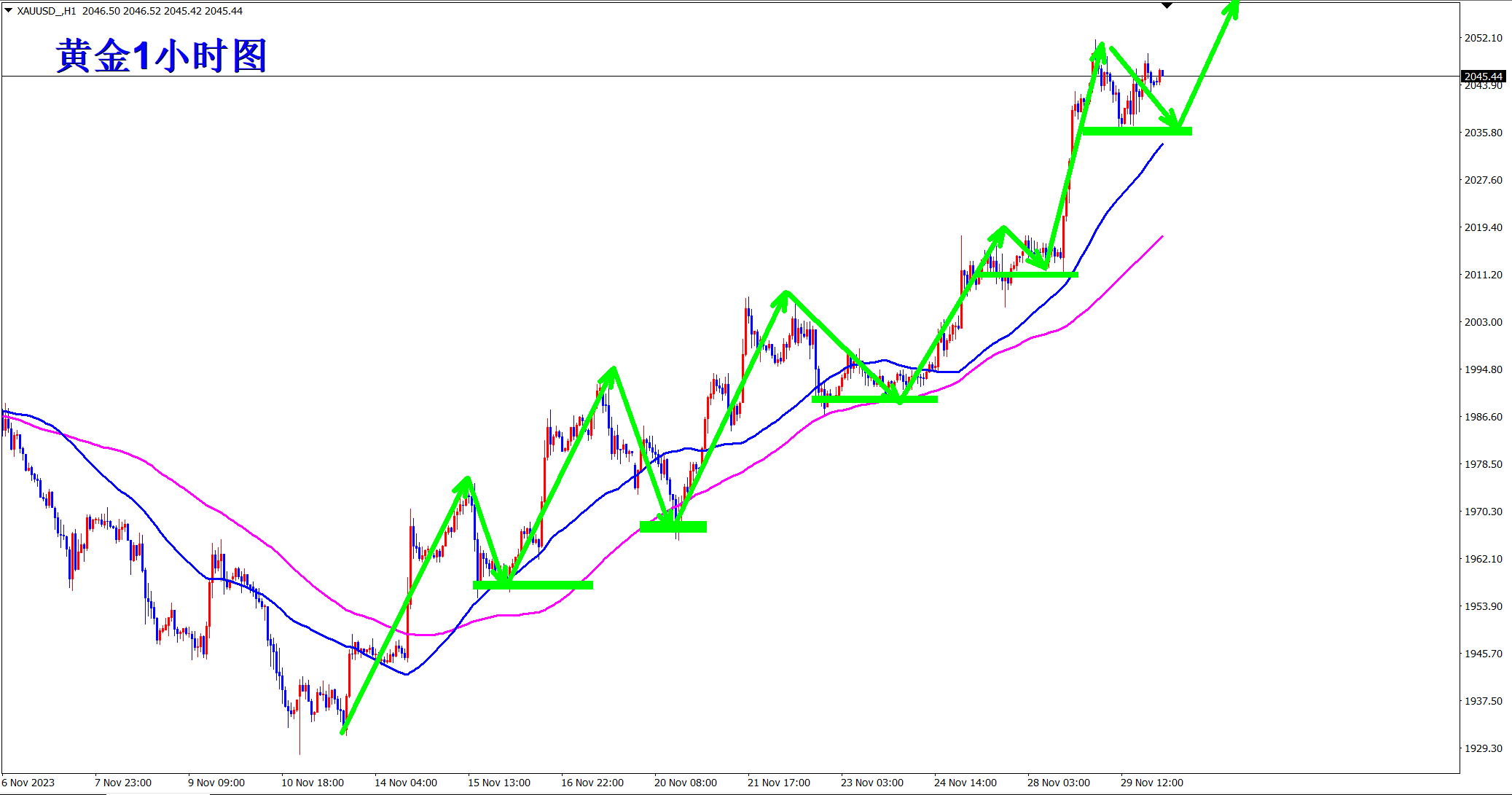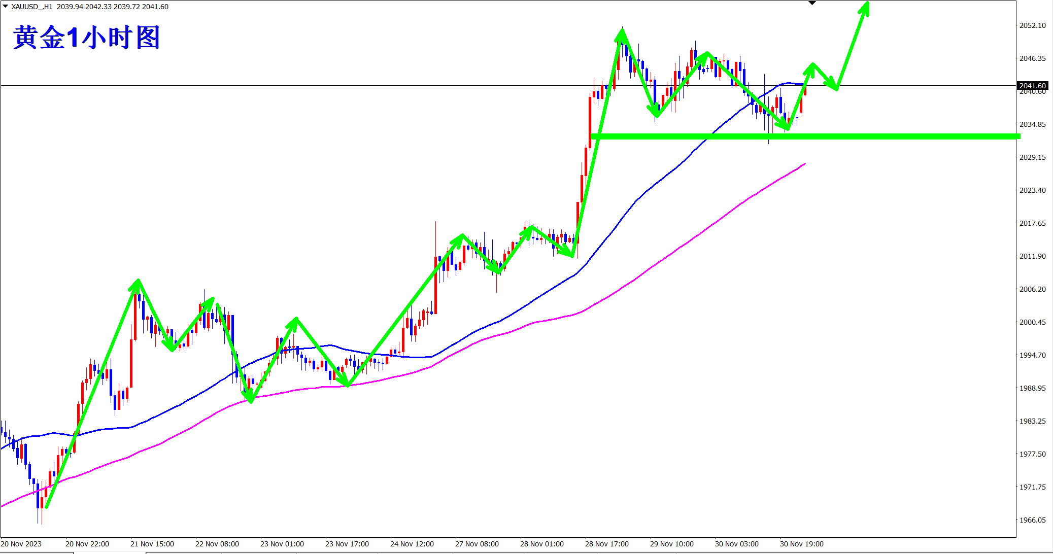 黄金当前依旧是上涨趋势不变,趋势上涨,顺势而为!早盘依托2035的支撑继续干多看涨! 黄金从1小时级别上看,一直都是维持均线支撑上方震荡上行,而且每次回踩均线支撑附近后都是新的波段上涨!经过昨日的调整,当前k线再次靠近均线支撑附近,新的上涨波段一触即发! 多,今日维持看涨思路不变!早盘