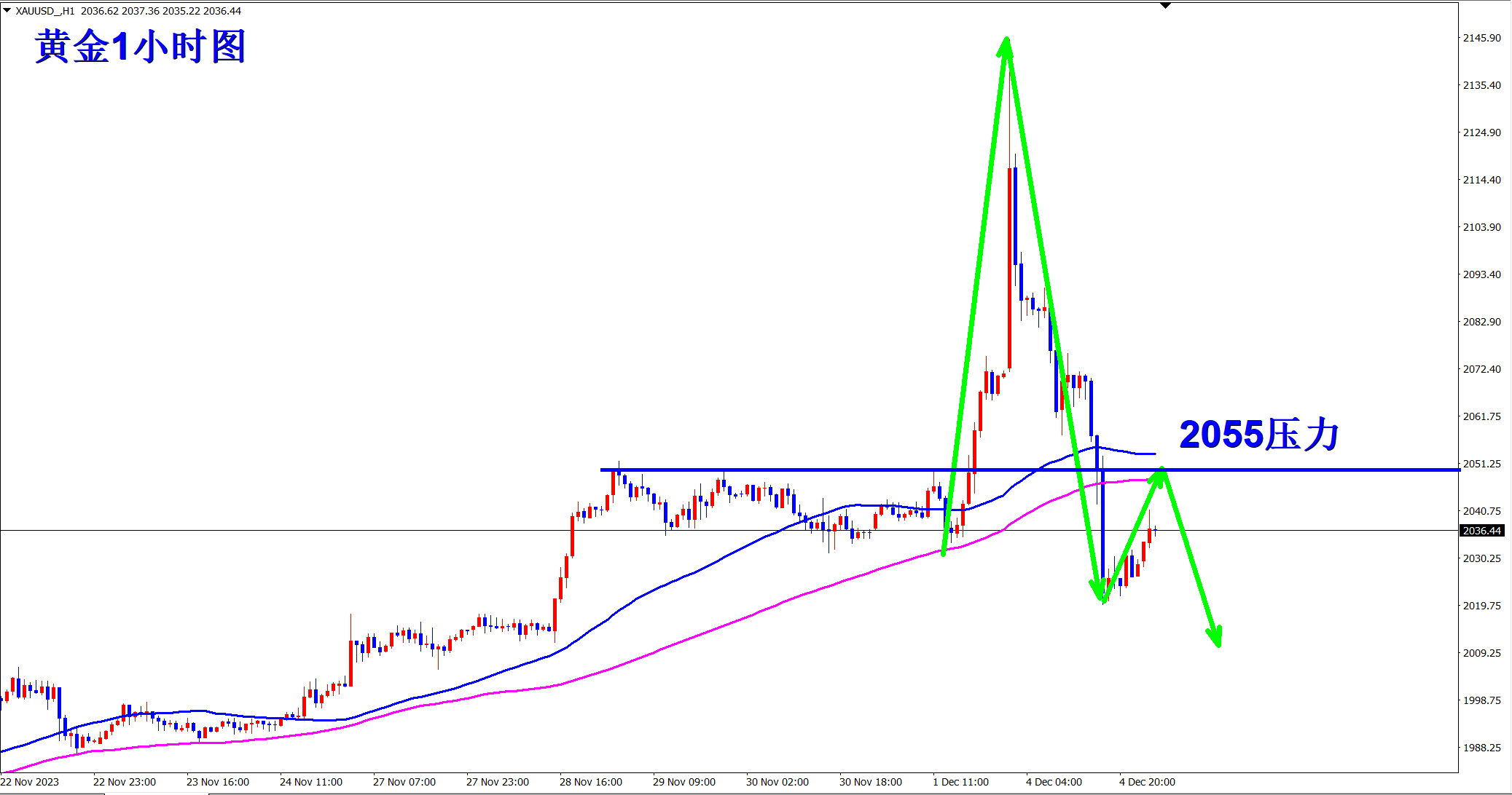 黄金今天反弹2037附近直接干空,文章也直接公开提示现价直接空,黄金如期下跌,先收割一波,顺势而为,趋势为王,黄金现在转空,那我们就毫不犹豫的干空。市场机会很多,做属于自己的行情才是长久生存之道。 黄金1小时均线开始拐头,行情走势转弱,今天黄金两次反弹测试2040上方阻力无功而返,再次下跌,说明黄