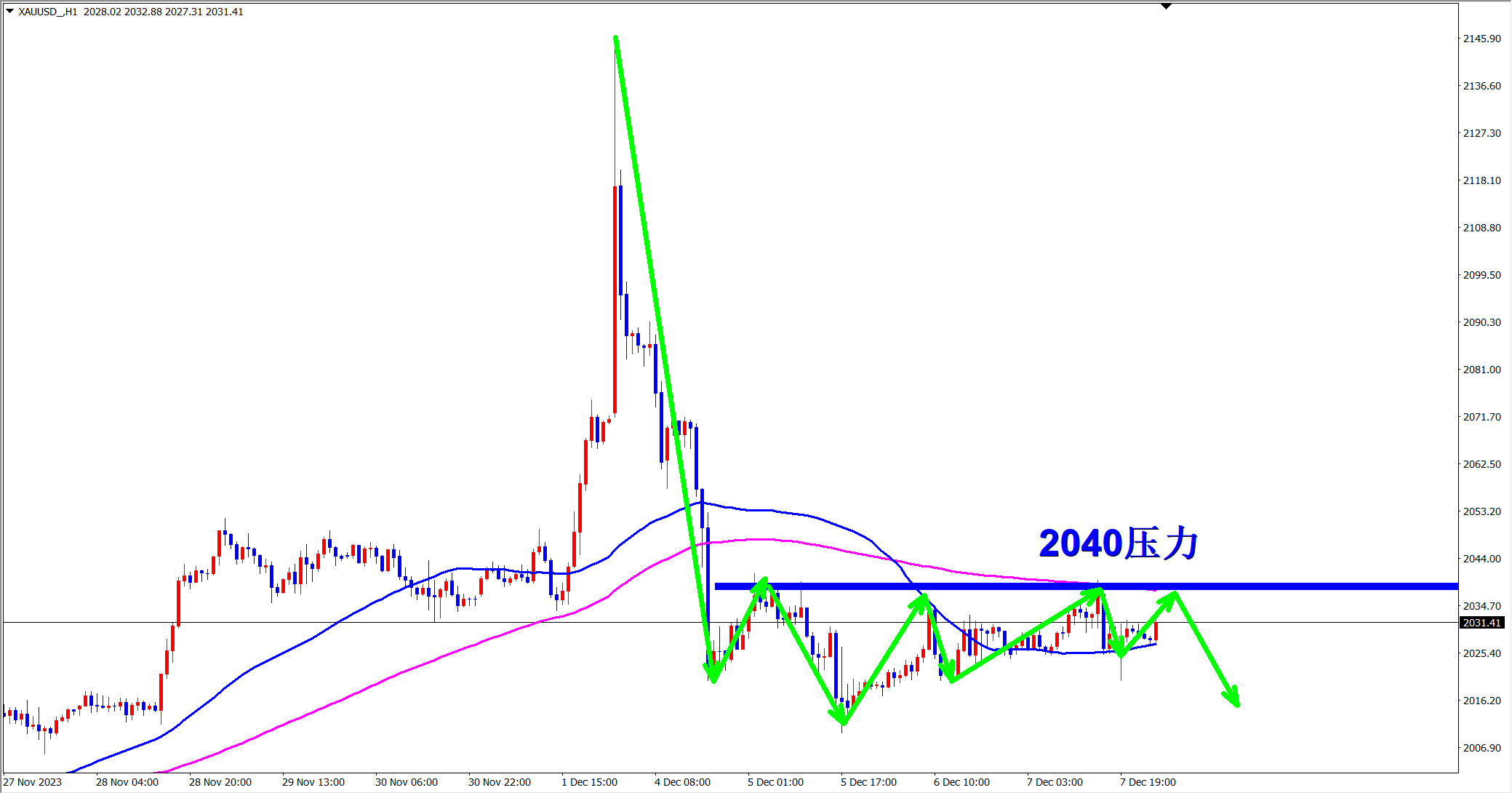 黄金昨日再次遇阻2040压力后下跌,王杨现价布局的2038空也如期大跌收割!当前黄金依旧是空头跌势,早盘2040压力继续干空! 黄金当前明显的下跌空头走势,1小时级别上,黄金也一直维持在均线下方,而且每次反弹遇阻2040后都再次大跌!这也是多头反弹难以逾越的高点压力,早盘反弹遇阻此位置后还是继续干空!