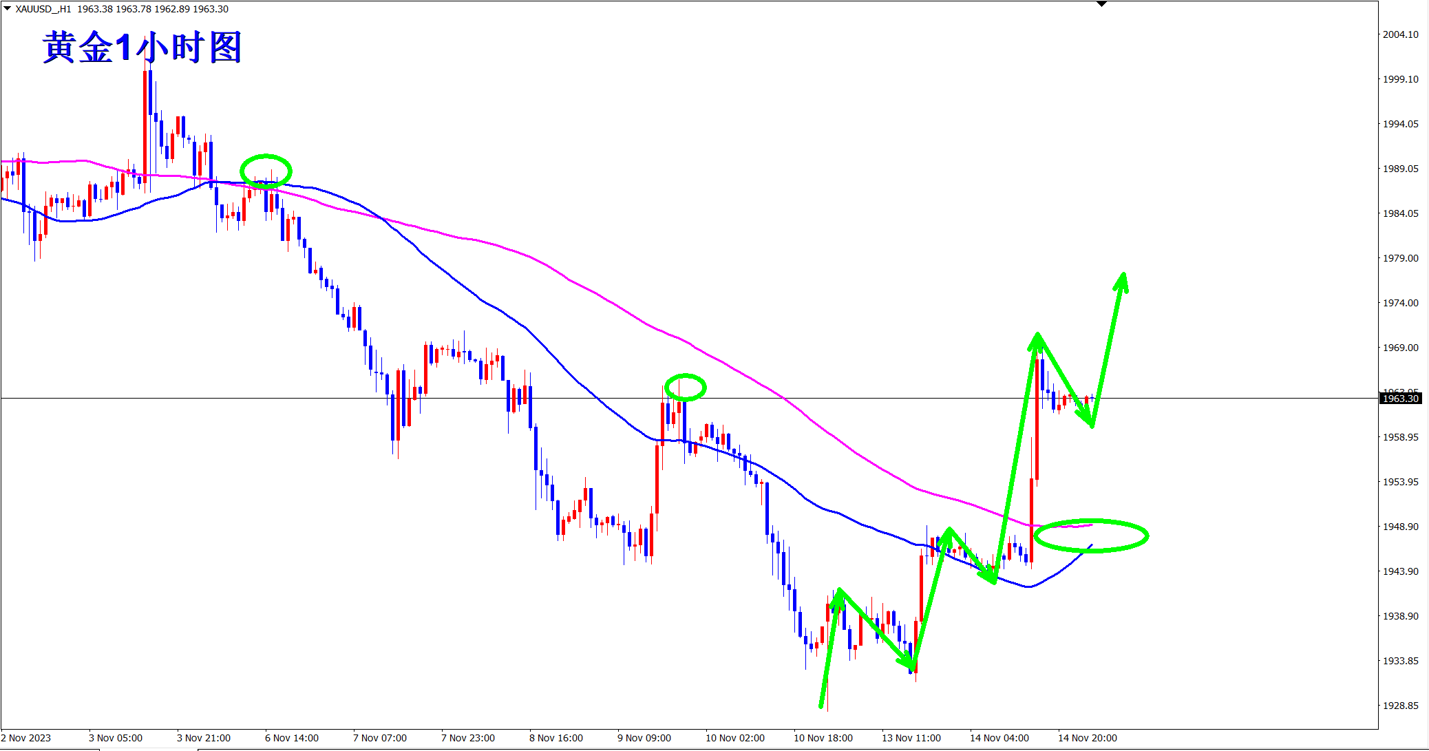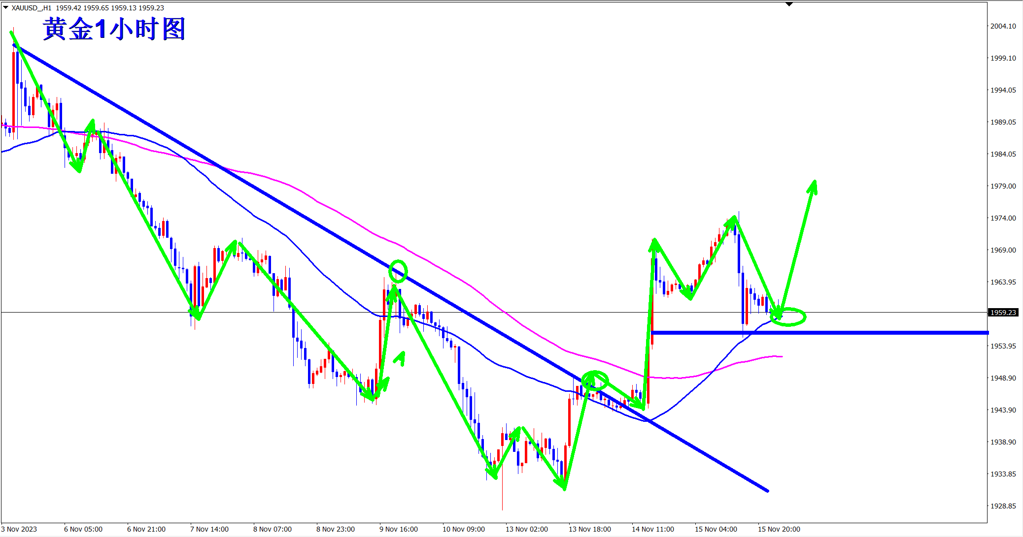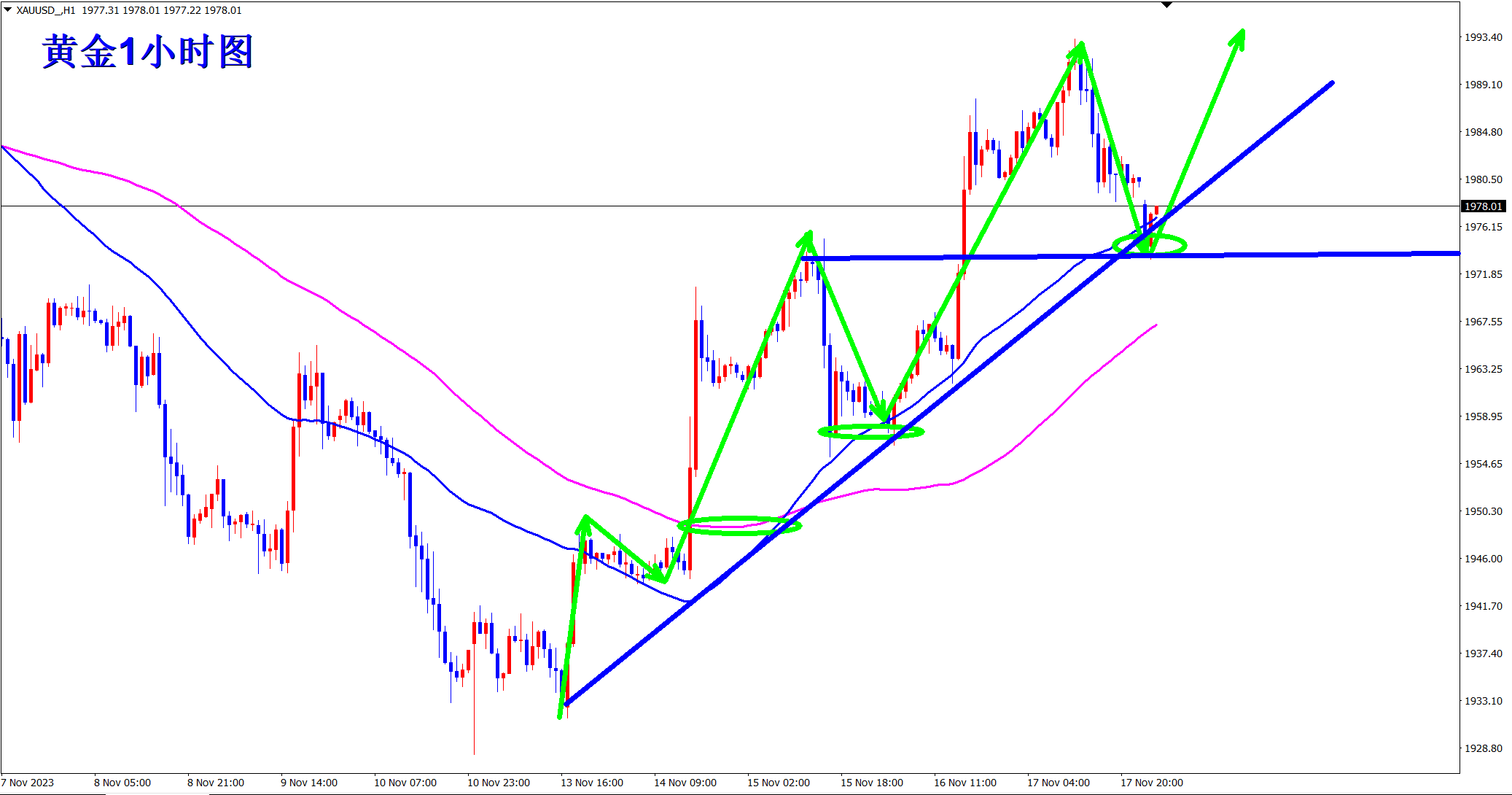 黄金昨日大幅回调,但是站稳在均线支撑上方,依旧是多头走势,早盘依托昨日回踩1955的支撑继续干多看涨! 黄金1小时级别上此前一路震荡下行,k线一直维持在均线下方运行!但本周黄金突破,并且每次回踩都是站稳在均线上方,昨日虽然回踩较多,但还是站稳在1小时级别均线支撑上方!王杨一直都是顺势交易者,行情