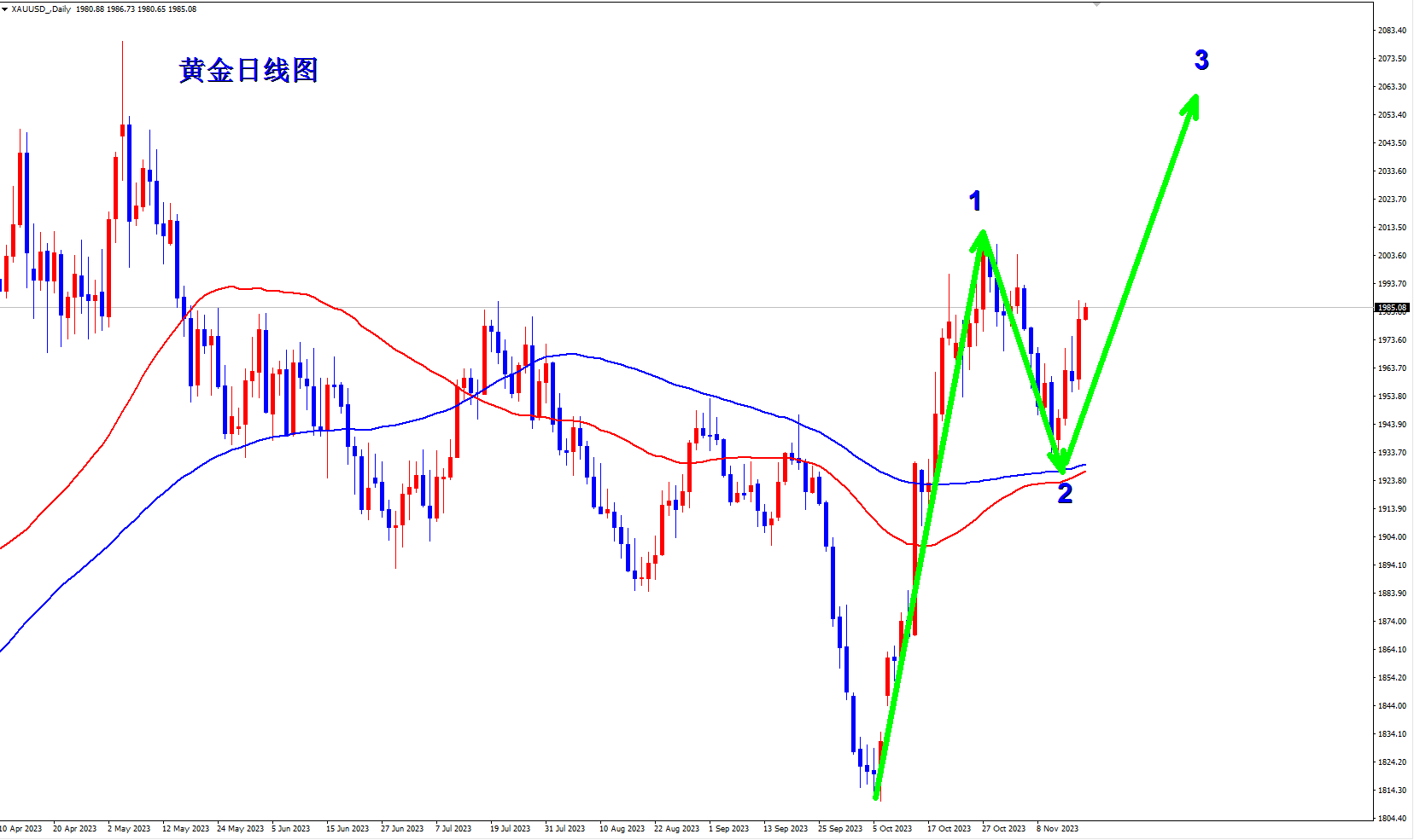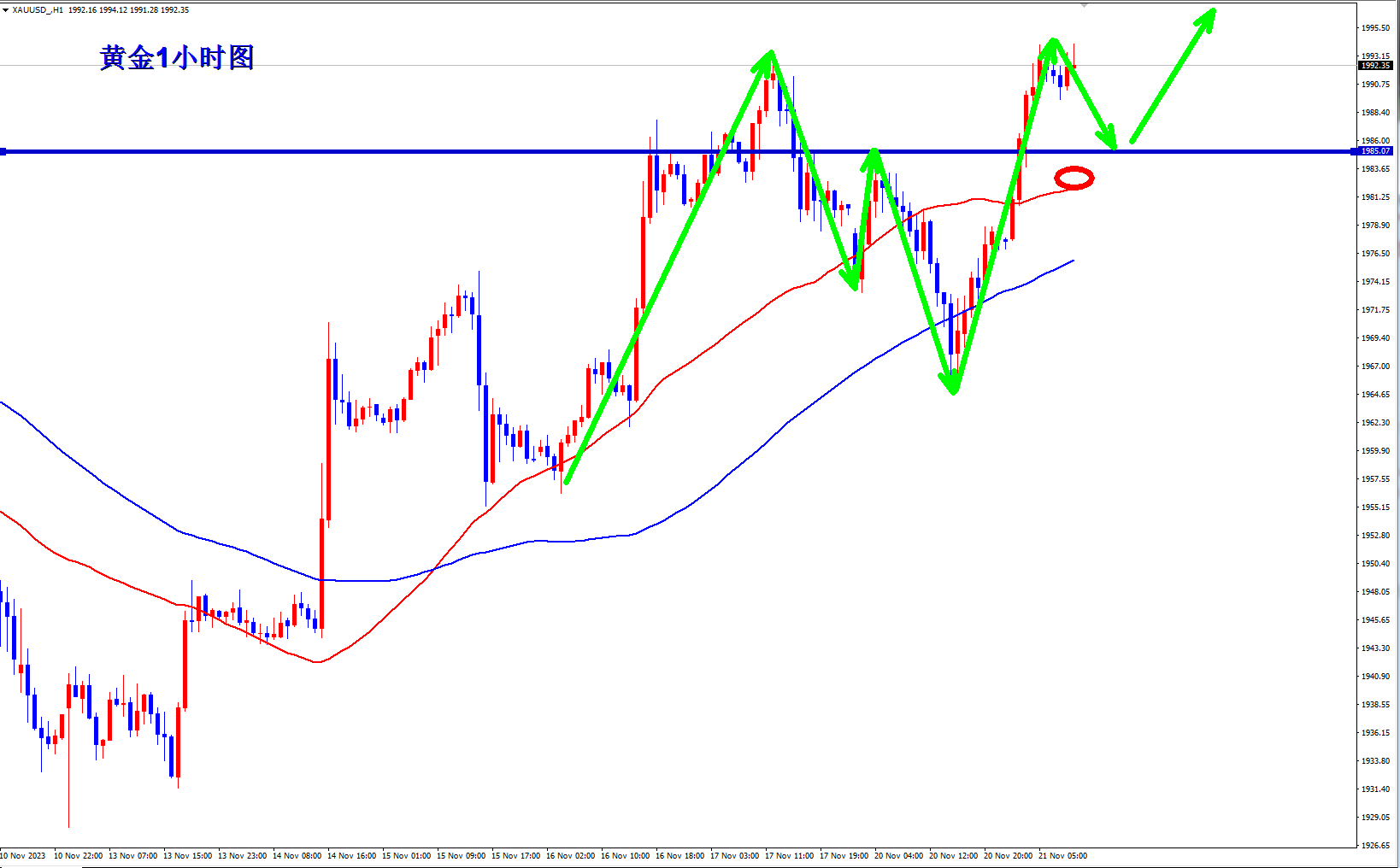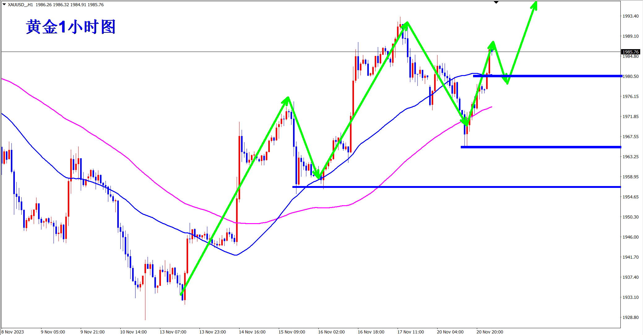 黄金又创新高了,还是多头的主场,昨日黄金下跌还是只是上涨途中的调整,只是调整幅度有点大,不过既然黄金调整这么深还能继续拉起来创新高,只能说多头更胜一筹。黄金欧盘回落继续干多。 黄金1小时均线稍微拐头之后又掉转向上,多头还是有很大空间,现在黄金下方支撑第一就是昨日的高点1985附近,现在转换成支