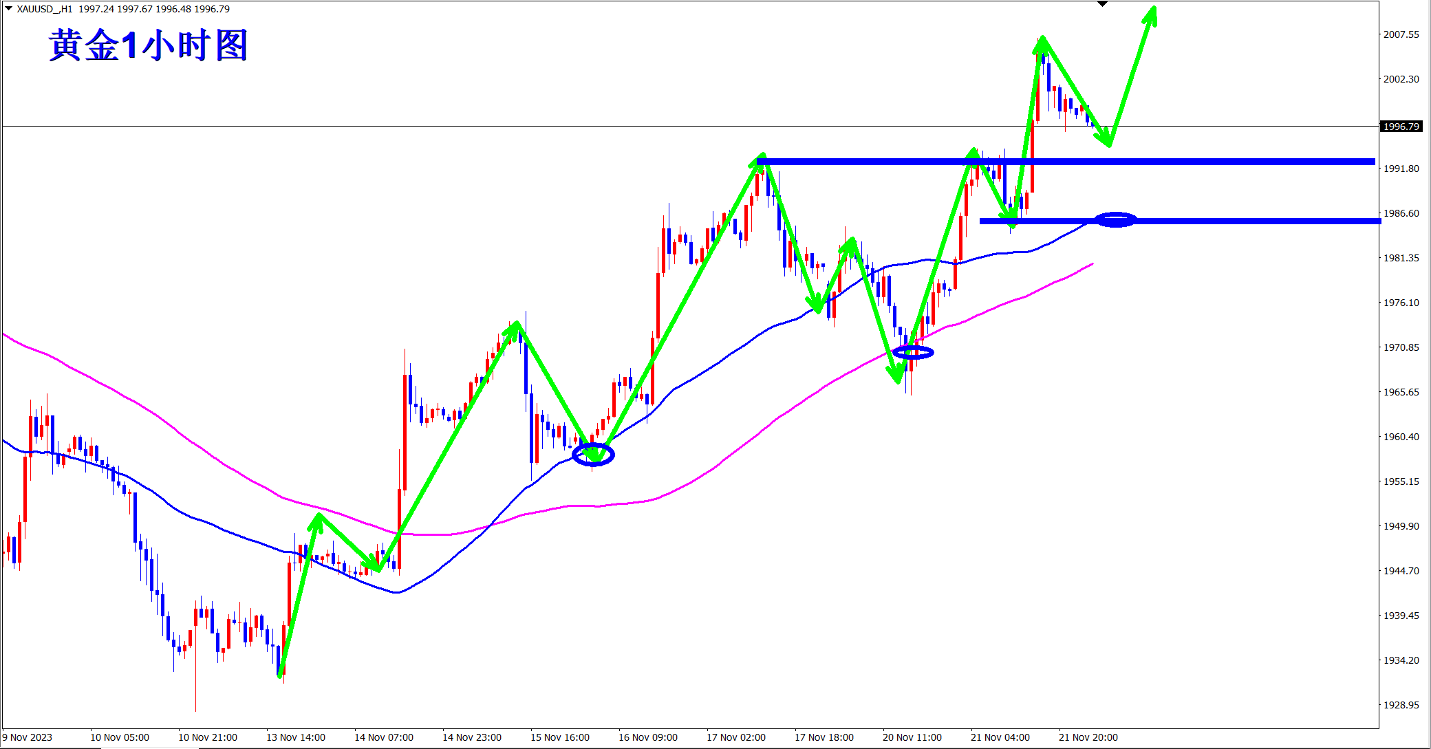 黄金昨日大涨突破新高,涨势继续!顺势轻飘飘,逆势乱糟糟!当前涨势继续,回调仍是干多机会,早盘1996现价直接多! 黄金1小时级别上依旧维持均线上方运行!按照此前的规律,黄金每次回踩均线支撑附近后都会再次开启涨势!没有跌破均线支撑前,继续将干多进行到底!熟悉王杨的朋友都知道我们是趋势交易者,今日