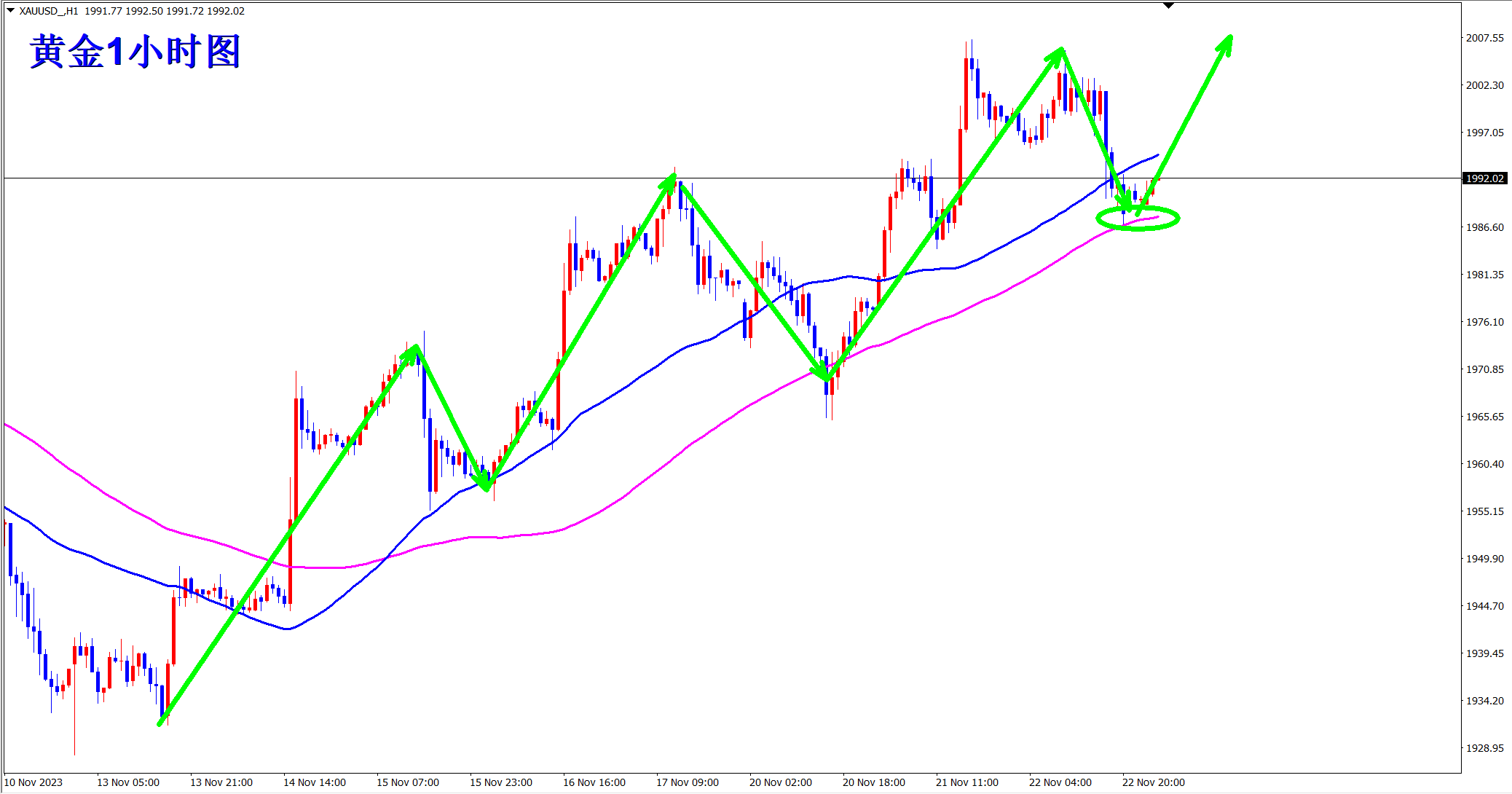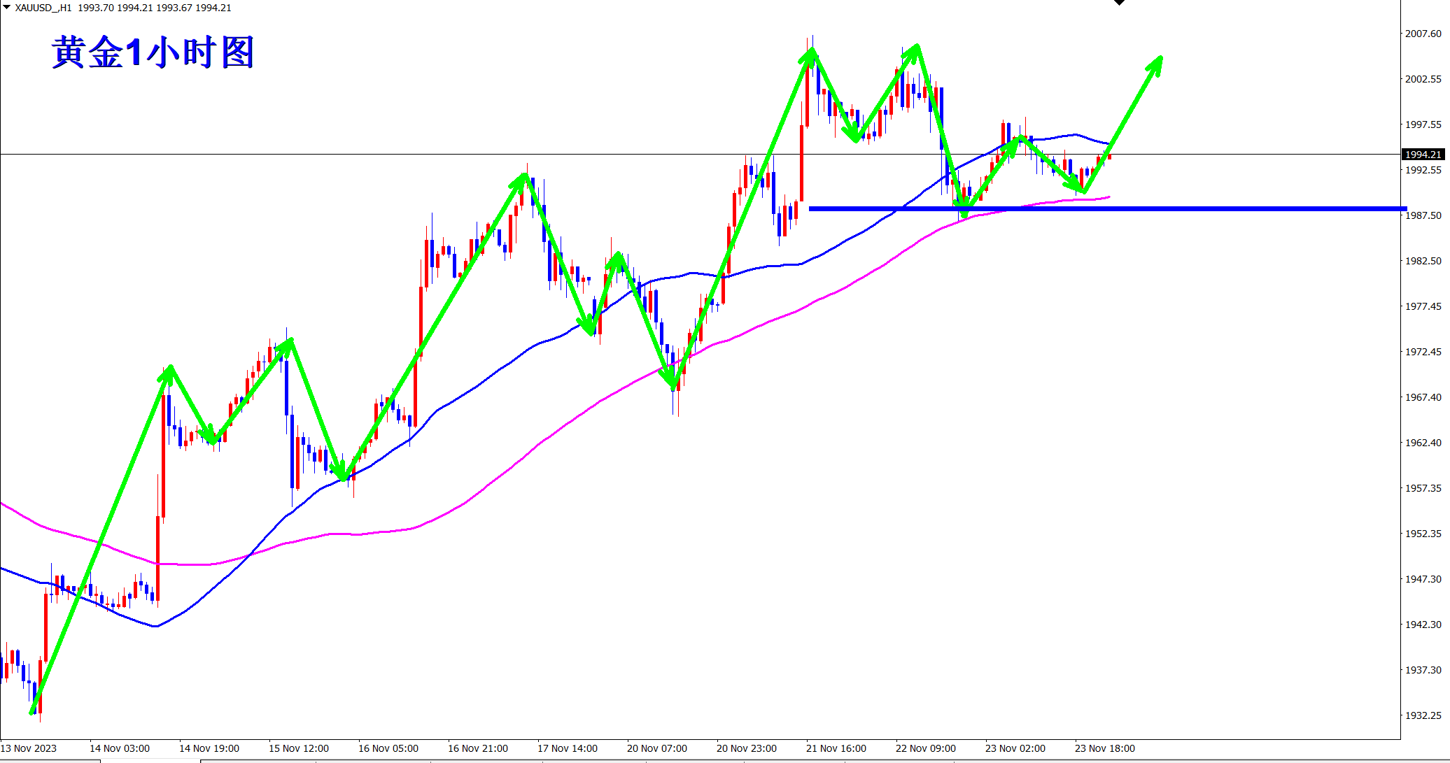 黄金当前窄幅运行,但属于上涨过程中的正常调整,回踩依旧是干多的机会!当前行情站稳均线支撑,早盘支撑位置继续干多看涨!依托1987支撑多! 黄金1小时级别上明显的属于多头上涨行情,每次回踩都是站稳在均线支撑上方!这次也不例外!还是继续在均线支撑上方!顺势轻飘飘,逆势乱糟糟!熟悉王杨的朋友都知道,