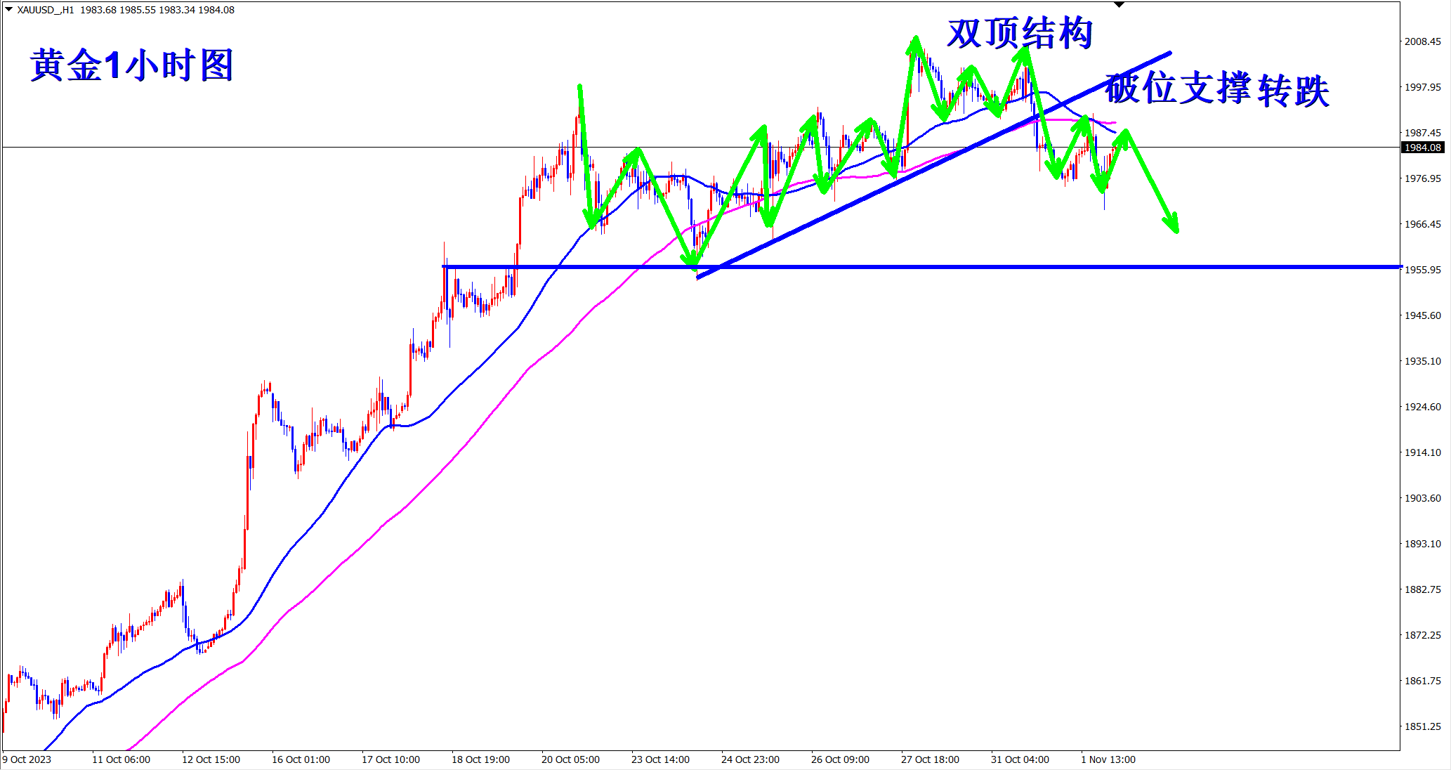 黄金当前已经构建三重顶部形态,周五大非农数据利多,但也无济于事!空头下跌开启,早盘反弹依托高点连线的压力位置做空!2000压力干空! 趋势为王,点位致胜!熟悉王杨的朋友都知道,我们一直都是顺势交易!此前黄金一路上涨,我们一路追随做多为主!但现在行情高位遇阻,并且连续三次上攻2010位置失败,形成