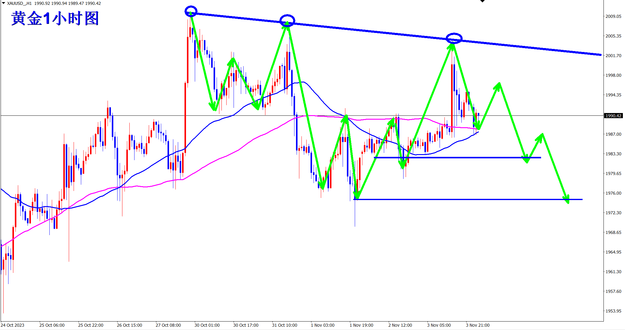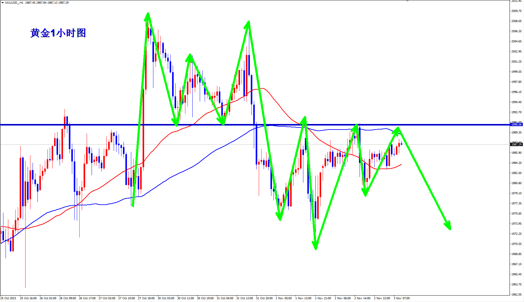 黄金当前开启跌势,昨日分别1992和1987干空,又是收获满满的一天!当前干空已经四连胜!顺势轻飘飘,逆势乱糟糟!跟上王杨的节奏,数钱!当前跌势继续,早盘反弹依托1985的压力继续干空! 黄金1小时级别上看,此前一直维持在均线上方运行,但是上周开始破位,之后除了周五大非农数据刺激下有刺穿,其他k线一直