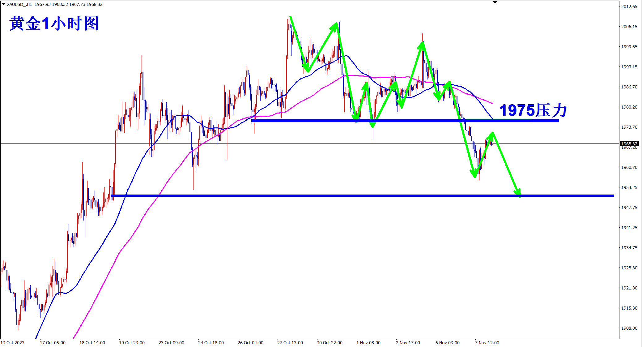 黄金昨日破位反抽继续受到均线压制,正式开启空头下跌走势!当前依旧是均线压制,早盘反弹依托1975的压力干空,现价1969直接干空! 黄金1小时级别可以看出,此前一直是维持均线支撑上行的,但是昨日行情破位后的反抽没有突破均线压制,而是继续下行!也就意味着下跌趋势开启! 当前行情反弹,又是再次