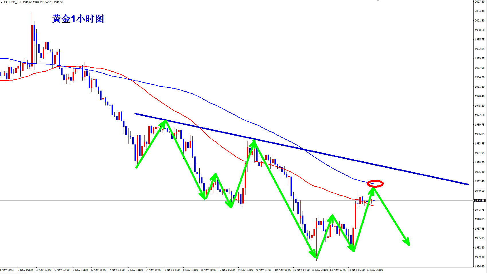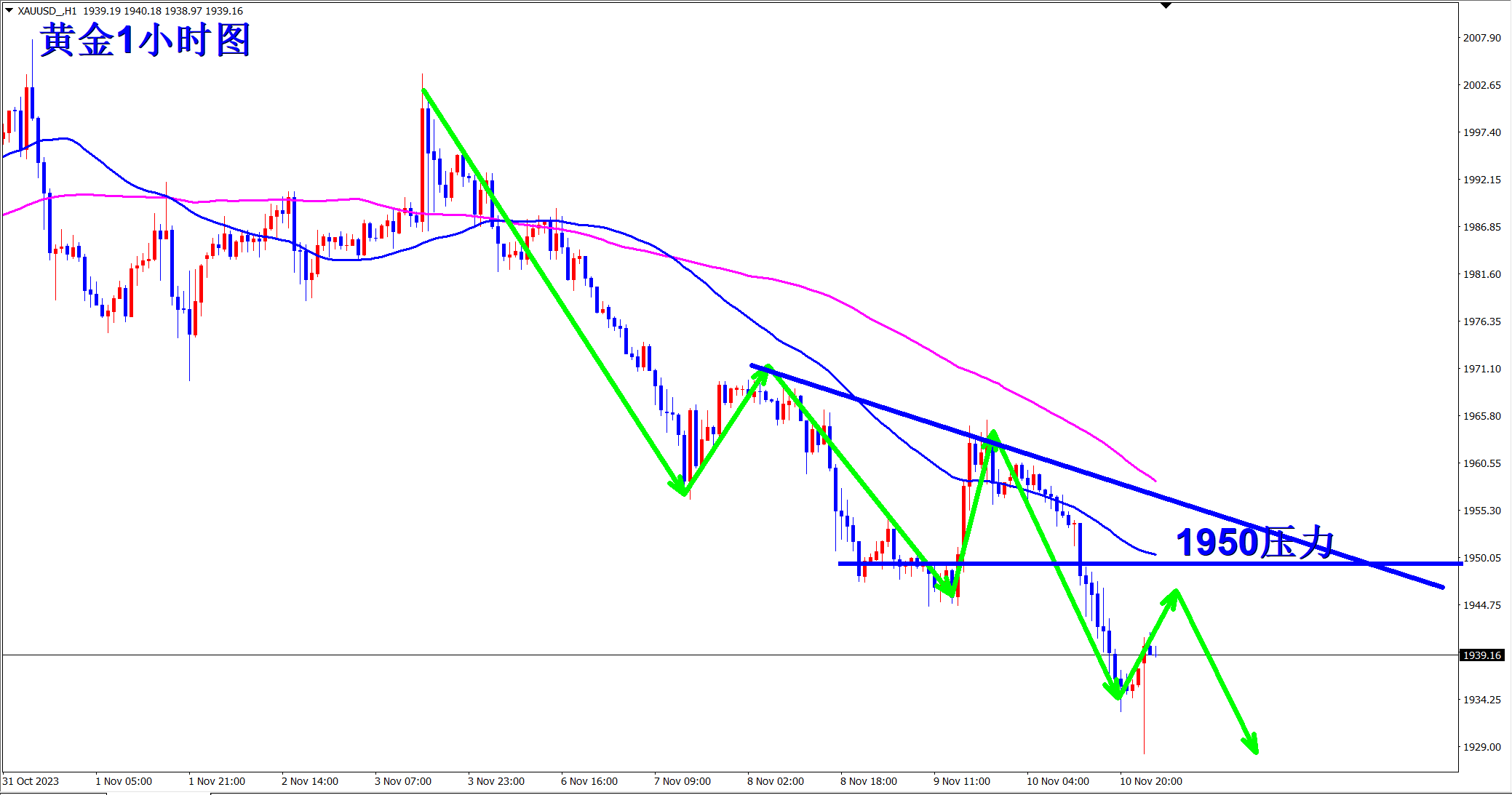 黄金当前依旧是下跌趋势不变,熟悉王杨的朋友都知道我是顺势交易者!当前既然还是跌势,早盘反弹遇阻后还是继续干空,依托1950的压力空! 黄金从小时级别上看,k线一直维持在均线下方运行!明确的下跌趋势!当前的压力位置就是均线压制,只要黄金的反弹不能突破1950的压制,也就是均线压力位置的情况下,就继续