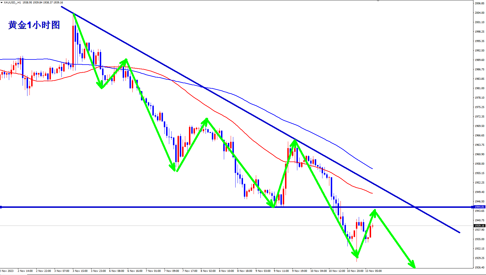 黄金开盘之后震荡走势,没有什么大的变化,不过趋势还是继续空头,顺势轻飘飘,逆势乱糟糟,顺势而为,黄金继续空,黄金午后现价1940直接空! 黄金1小时均线继续死叉向下空头排列,黄金1小时空头趋势,下行趋势线一直压制黄金上涨,黄金上周五美盘跌破新低之后黄金空头趋势继续,黄金周五美盘也就1943开始继续